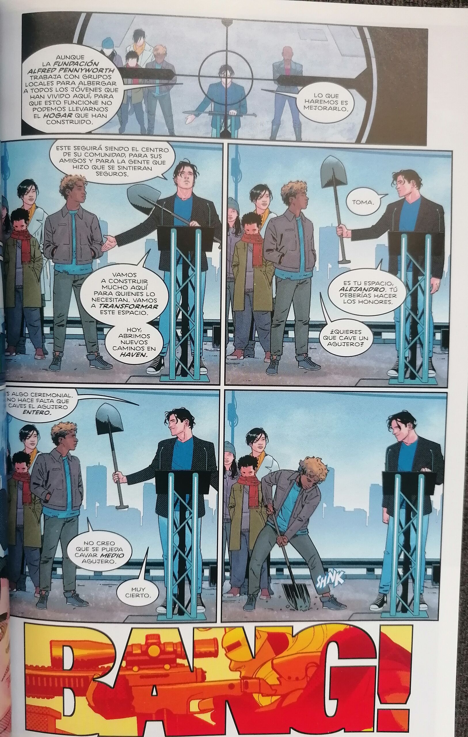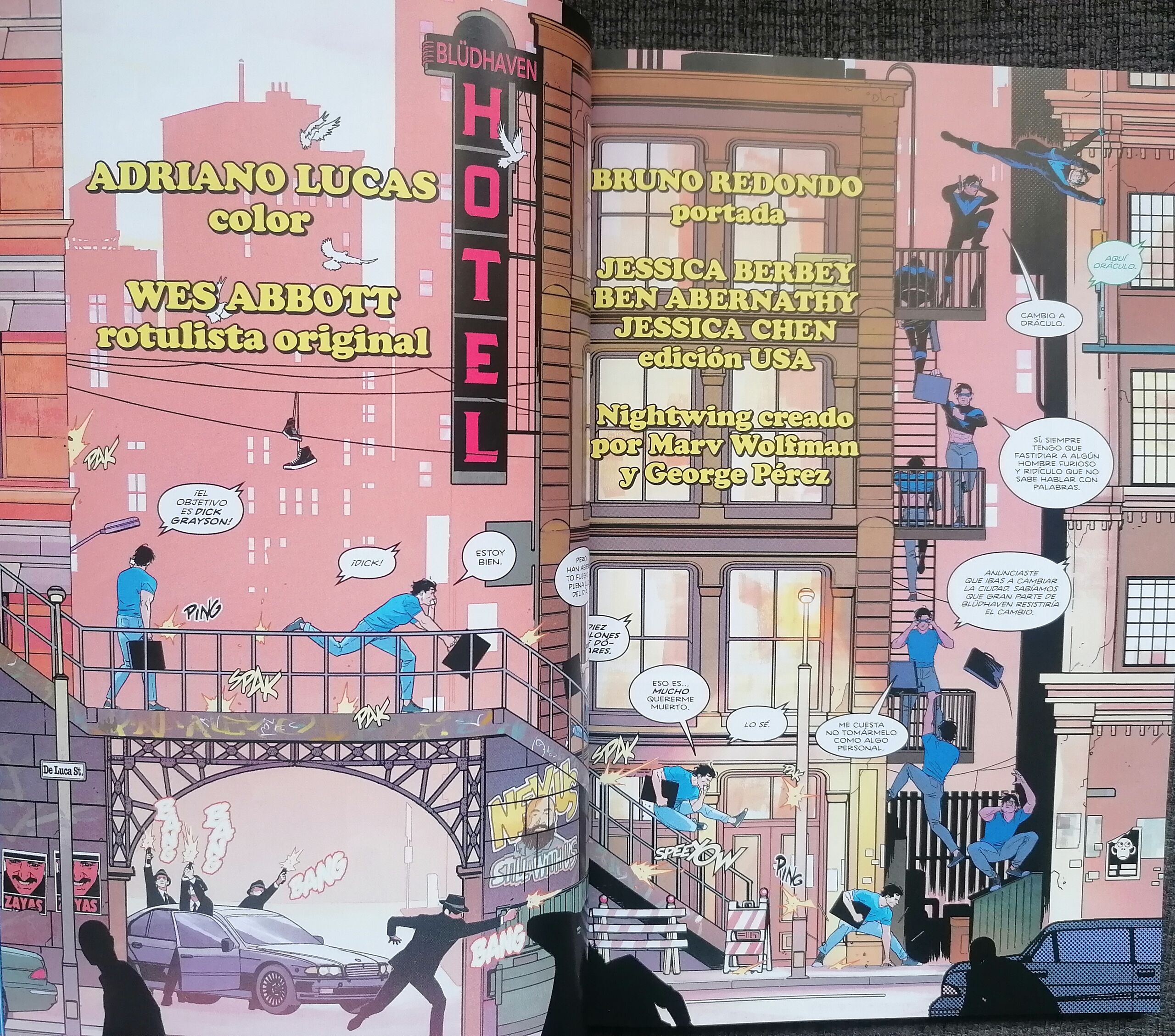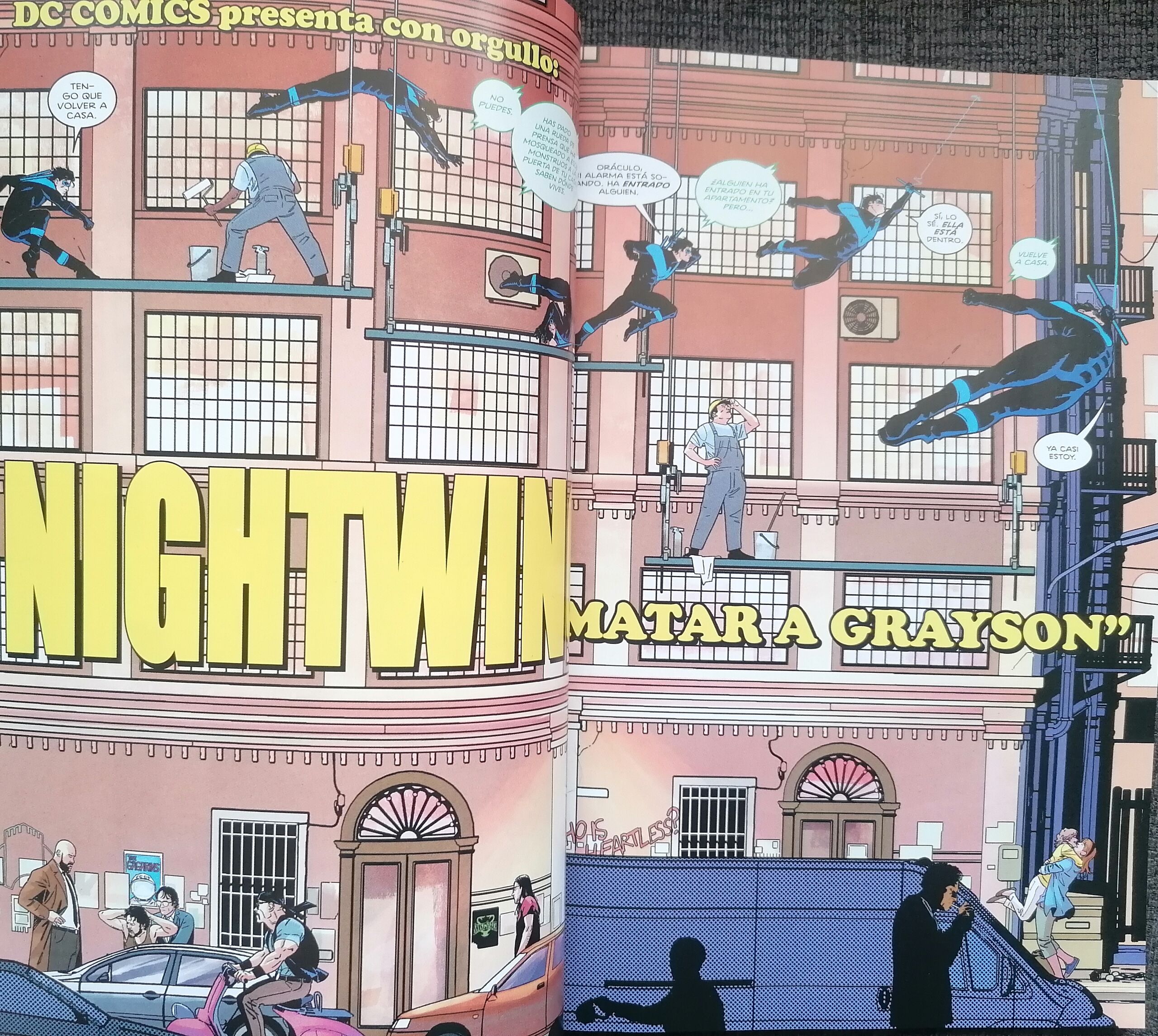 Como es lógico al ser una rústica y no una grapa se pierde el efecto que en su día tuvo esa grapa alargada que se podía estirar y que tenía el plano secuencia en horizontal. A pesar de no tener ese efecto, no se pierde ni un ápice de la intensidad de dicha grapa. Funciona perfectamente en esta rústica y tanto este tomo con el anterior son un punto de entrada maravilloso para esta cabecera. No es necesario que sepas la historia de Nightwing más allá del hecho de haber sido uno de los Robin de Batman porque Taylor te va guiando con maña y dulzura por el pasado y presente del personaje.