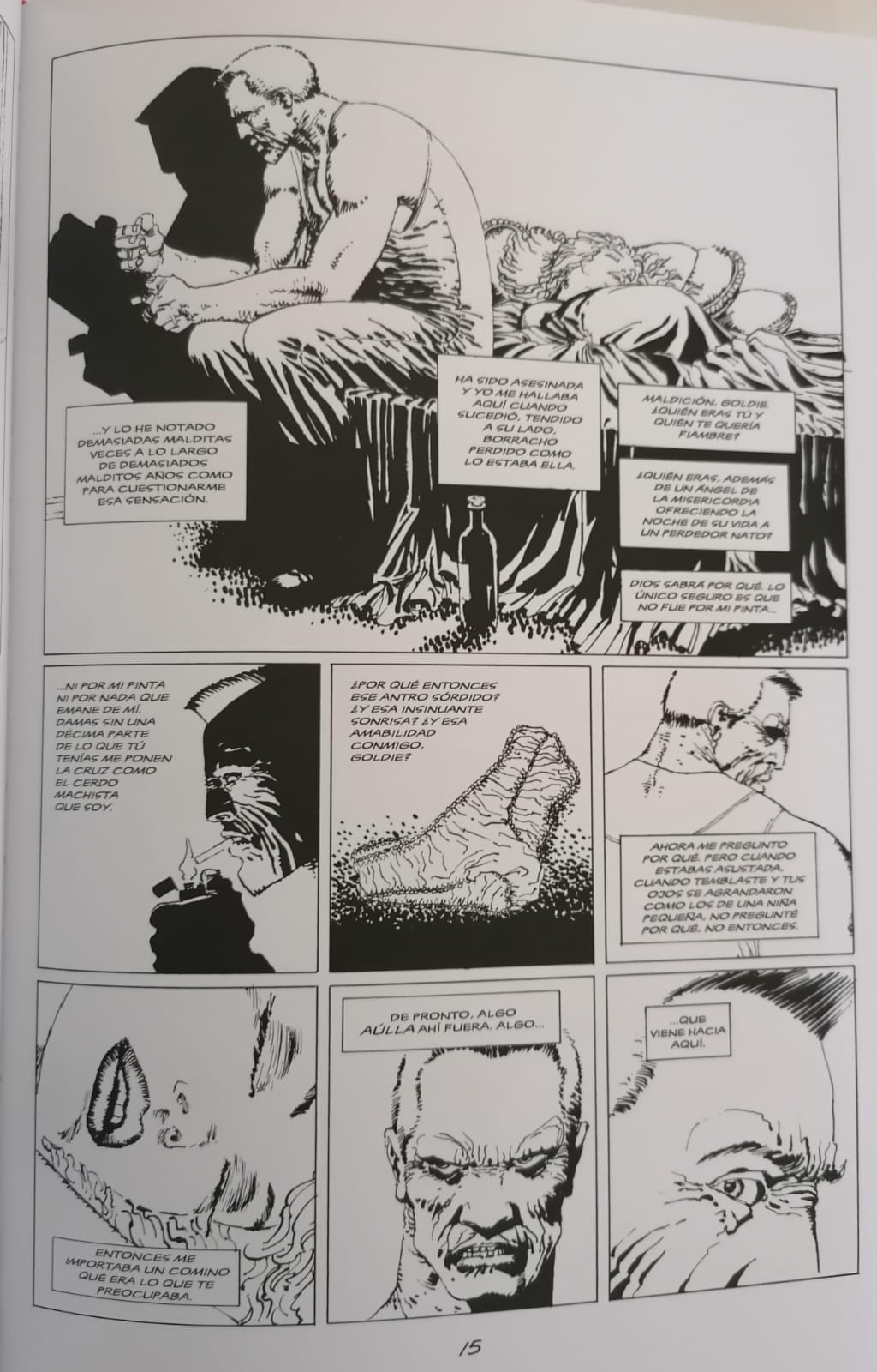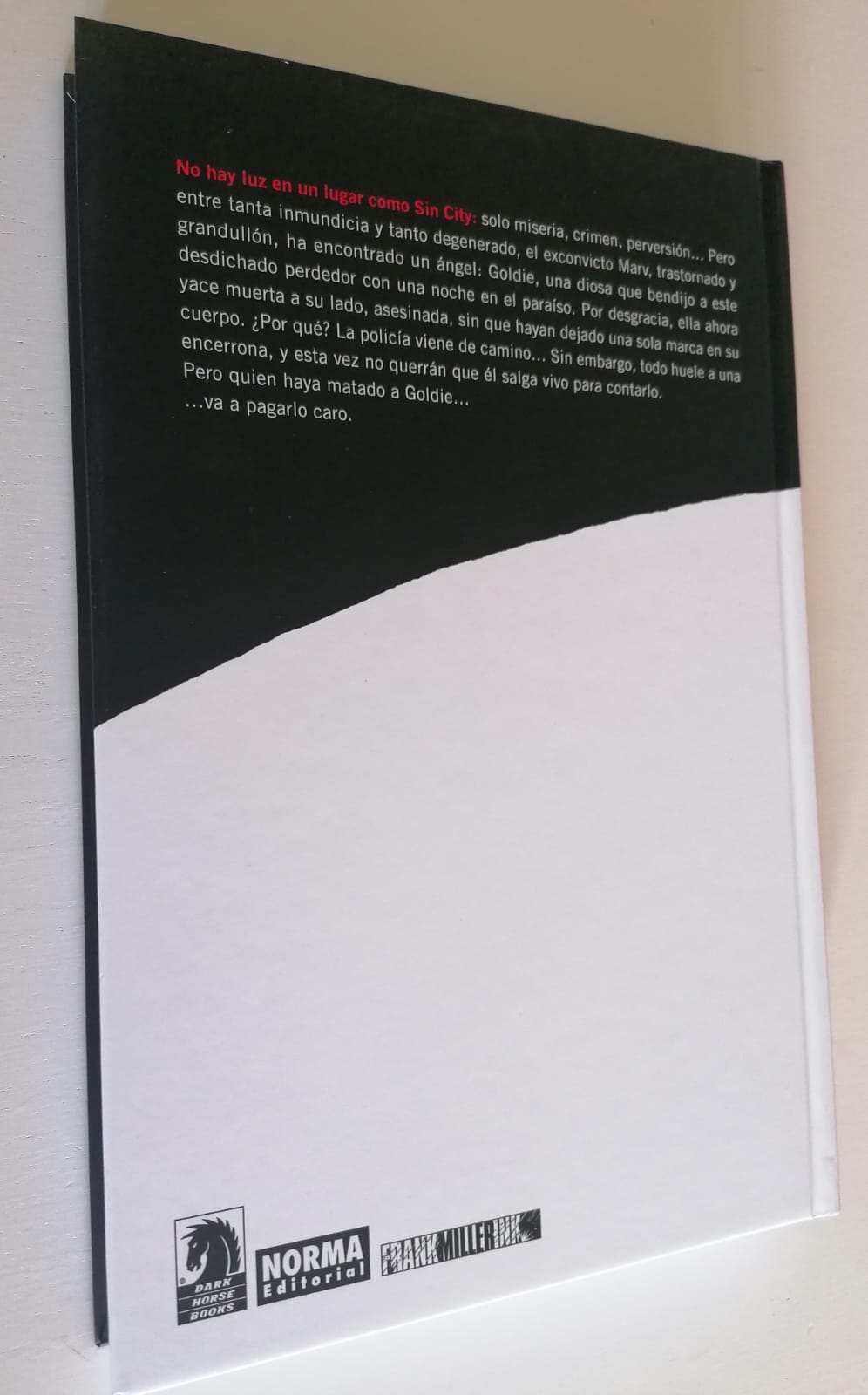Información para neófitos. La joven Goldie ha sido asesinada. A su lado un hombre corpulento y lleno de cicatrices llamado Marv al que ha regalado la mejor noche de su vida y el peor despertar posible. Él suspira por ella al verla muerta a su lado y le lanza unas palabras con voz en off en las que le declara su amor. Unas palabras con las que jura vengarse y descubrir quién y por qué la han matado. Así arranca la historia de Sin City. Mismo inicio en los cómics que en el cine.