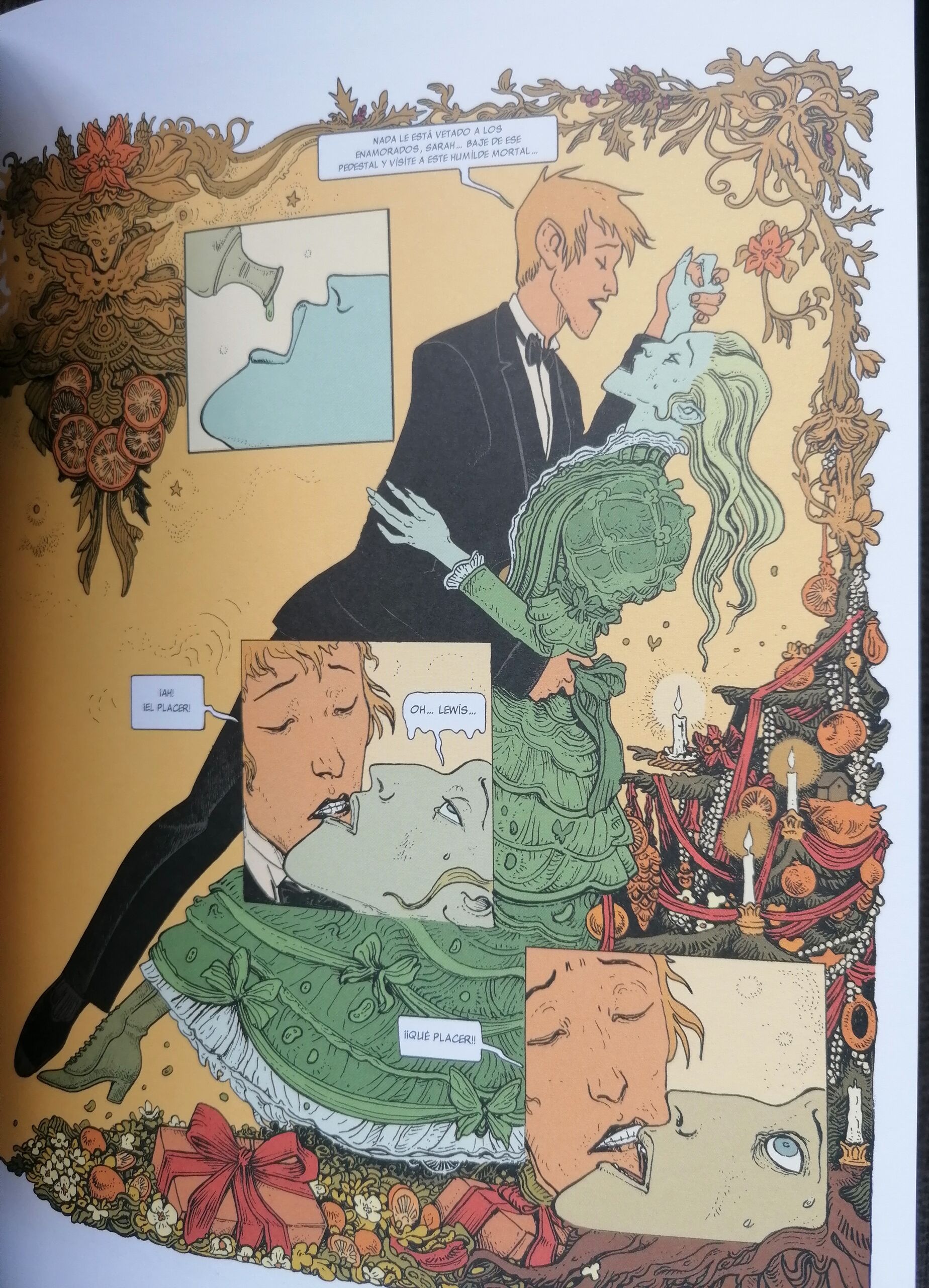 El protagonista de la obra es Lewis Pharamond. Como he dicho antes este joven escritor inglés decide pasar el luto por la muerte de su madre en Childwickbury, la mansión donde pasó su años mozos. Allí se dará cuenta muy pronto de que la inspiración le es esquiva a pesar de que la casa invita a imaginarse excelsos relatos de terror. Solo la llegada de un fantasma llamada Sarah abre la mente del joven Lewis, pero su relación con ella será tan pasional y tan lúgubre que muy pronto pasará del amor al odio llegando a extremos inimaginables. Este amor tormentoso a prueba de mentiras y codicia va evolucionando con tanta fuerza que muy pronto te sientes atrapado como lector y en ese preciso momento te costará mucho dejar de leer este cómic. Traducción: te atrapa y no vas a oponer resistencia.