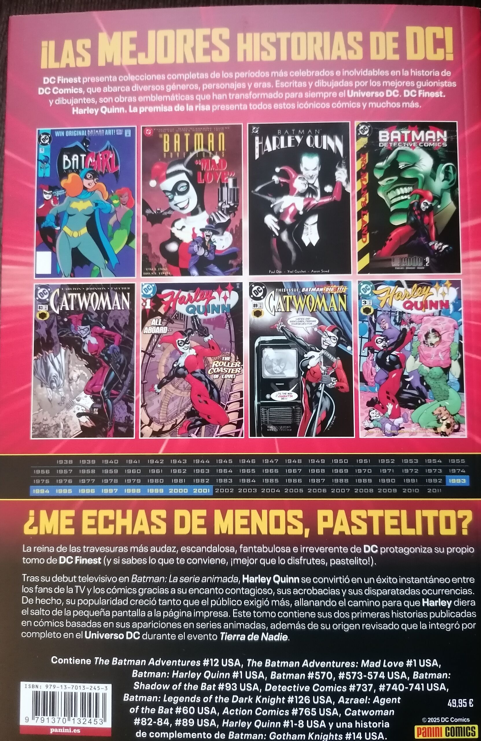 Enseguida seguimos con más detalles, pero antes vamos con el apartado técnico de este DC Finest Harley Quinn, la premisa de la risa: guiones y dibujo con con Kano, Paul Dini, Karl Kesel, Bruce Timm, Pete Woods o Terry Dodson, rústica con solapas, editorial Panini, contiene Action Comics 765, Batman: Legends of the Dark Knight 126, The Batman Adventures 12, Azrael: Agent of the Bat 60, Batman 570 y 573-574, Batman: Shadow of the Bat 93, Detective Comics 737, 740-741, Catwoman 82-84 y 89, The Batman Adventures: Mad Love, The Batgirl Adventures, Batman: Harley Quinn; Batman: Gotham Knights 14 y Harley Quinn 1-8, 624 páginas y un precio de 49,95 euros.