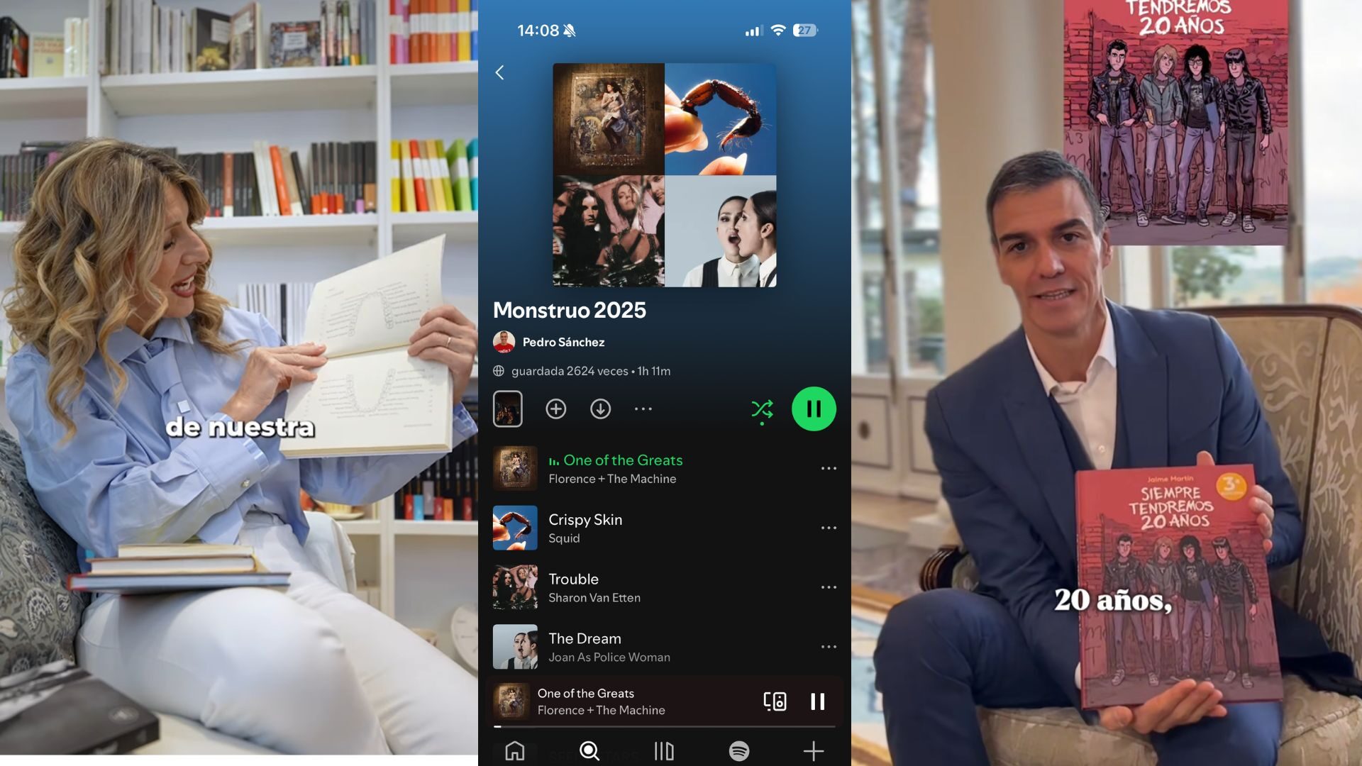 El presidente del Gobierno, Pedro Sánchez, ha compartido públicamente su lista de canciones favoritas de 2025 a través de Spotify. Bajo el título Monstruo 2025, la playlist reúne 18 temas de artistas nacionales e internacionales y tiene una duración aproximada de una hora y once minutos. El propio Sánchez la publicó hace pocos días en redes sociales con el mensaje: "2025 ha sido un gran año, también en la música", explicando que se trata de canciones "que siempre me acompañan".