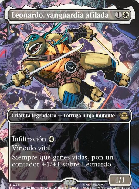 Leonardo, vanguardia afilada. Se trata de una criatura rápida, con la habilidad de infiltración. Esta habilidad permite que la carta se juegue por solo una llanura si se devuelve a la mano una criatura atacante no bloqueada que controlas durante el paso de declarar bloqueadoras. Es decir, Leo entra por sorpresa con vínculo vital, pudiendo ganar vida al hacer daño a un oponente. Cada vez que ganes vida, se pone un contador sobre Leonardo, con lo que entra reforzado. La habilidad de infiltración, combinada con la capacidad de colocar contadores +1/+1 de Michelangelo cada vez que se ataca, provocará que se llene la mesa de tokens de comida a la vez que los contadores protegerán la estrategia de Leonardo. Caos y orden en equilibrio.