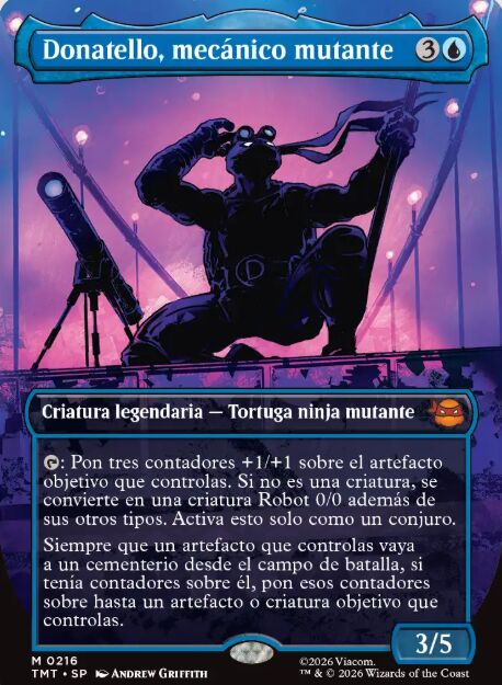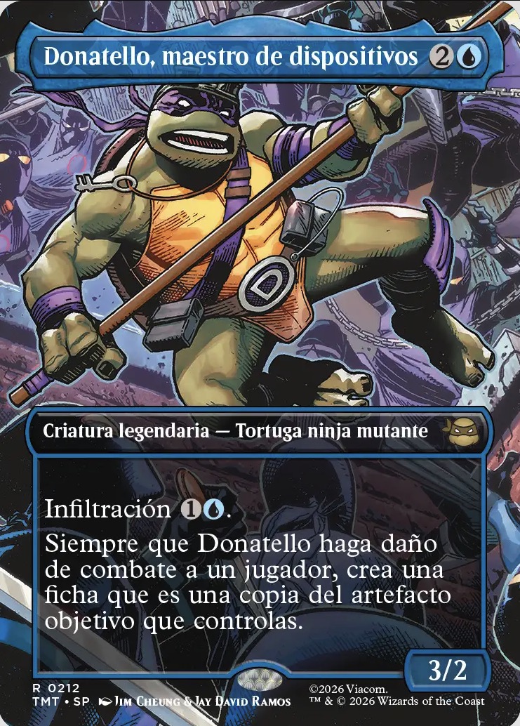 Donatello es un manitas, y su carta Donatello, maestro de los dispositivos, es la representación de su inteligencia a la hora de crear aparatos y controlar la logística del equipo. Una carta azul que tiene la habilidad de infiltración, lo que le permite entrar al campo de batalla por menos coste devolviendo a otra criatura a la mano. Siempre que Donatello haga daño de combate a un jugador, crea una ficha que es una copia del artefacto objetivo que controlas. Llenar la mesa de artefactos y desencadenar una afinidad, recuerda a las mecánicas de mazos de artefactos que dominan la mesa.