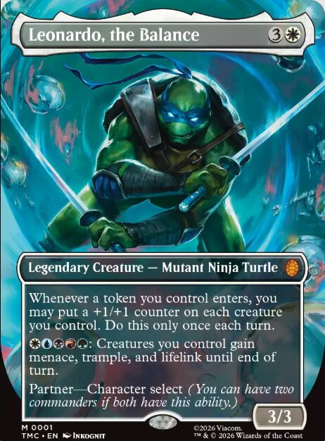 Leonardo, the Balance, es el líder de las Tortugas Ninja, además de ser la piedra angular de sus hermanos. Se trata de una carta que juega con todos los colores de maná, con lo que las posibilidades de usarlo como criatura tribal de ninjas y/o tortugas son infinitas. Cuando un token entra en juego (criaturas, comida, mutágenos, etc.), puedes poner un contador +1/+1 sobre cada criatura que controlas. Una vez por turno y beneficiándose de mecánicas de proliferar. Pero su gran poder es si pagas un maná de cada color, para darle a todas las criaturas arrollar, amenaza y vínculo vital hasta el final del turno. Todo esto con la habilidad de Partner, que te permite tener un segundo comandante con el que poder llegar a tener un mazo de cinco colores. El sueño de cualquier equipo.