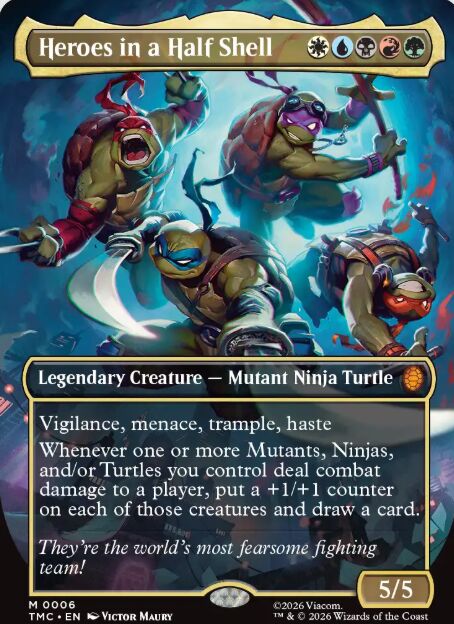 Al ser un personaje de color blanco, su verdadero potencial es que puede utilizarse con comandantes pentacolor, como Morophon, the Boundless, que es todo tipo de criatura. Pero en esta edición, su gran poder viene del comandante de cinco colores, Heroes in a Half Shell, que es el equipo de las Tortugas Ninja al completo. Luchar al lado de sus hermanos es la mejor opción para un líder como Leonardo. Cualquier combinación es perfecta para que Leonardo esté acompañado por el equipo al completo, pues se trata de una criatura con vigilancia, amenaza, arrollar y prisa. Un Cowabunga en toda regla. Cada vez que uno o más mutantes, ninjas y/o tortugas que controles hagan daño de combate a un jugador, pones un contador +1/+1 sobre cada una de esas criaturas y robas una carta. Una carta que representa el espíritu de equipo que siempre ha defendido Leonardo, y que promete hacer del mazo de Commander pentacolor de TMNT uno de los más divertidos para jugar.