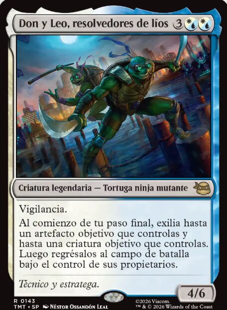 Leonardo forma equipo con todos sus hermanos, por eso Dony Leo, resolvedores de líos, es la carta que con vigilancia mantiene la calma en el equipo. Una carta pensada para controlar el campo de batalla, con la perfecta colaboración de Donatello. Al comienzo de tu paso final, exilia hasta un artefacto objetivo que controlas y hasta una criatura objetivo que controlas, luego regrésalos al campo de batalla de sus propietarios. Con esto, consigues que se disparen habilidades activadas de esas cartas después del paso final, reforzando el campo de batalla.