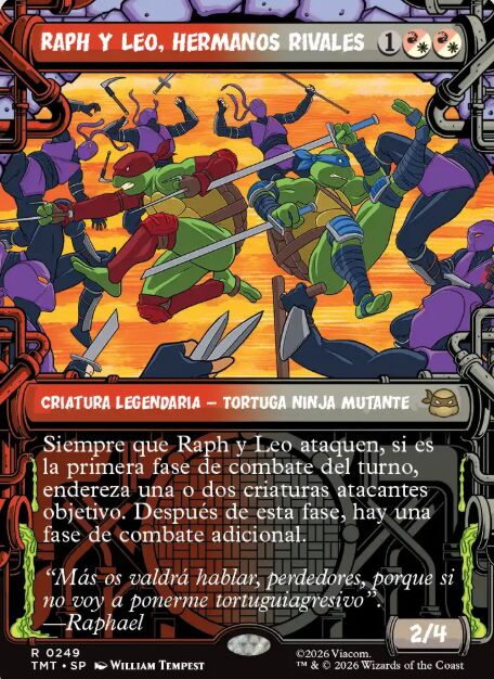 Con Raphael la relación no es tan armoniosa, por eso Raphy Leo, hermanos rivales, hace honor a su título. Se trata de una criatura que siempre que ataque, si es la primera fase de combate del turno, endereza una o dos criaturas atacantes objetivo. Después de esa fase, hay una fase de combate adicional. Es decir, que si enderezara una carta de Leonardo y otra de Raphael, los hermanos pegan dos veces. Carta atrevida y muy divertida.
