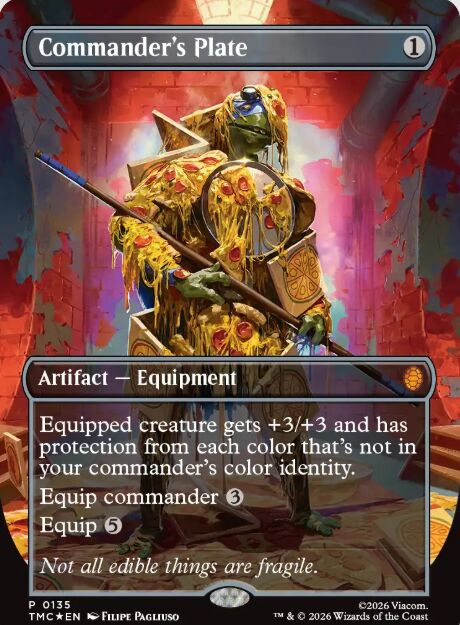 Si hablamos de artefactos para apoyar a la ciencia de Donatello, hay dos que destacan. Por un lado, Commander's Plate, una lluvia de pizzas de ¿pepperoni? Se trata de un artefacto que por apenas un maná incoloro, hace que la criatura equipada (teniendo un coste de equipar de solo 3 incoloros en el caso de ser un Comandante), le otorga protección de cada color que no esté en tu comandante. Es decir, a Donatello le daría protección contra 4 de los 5 colores. Casi invencible es la cobertura de queso derretido.