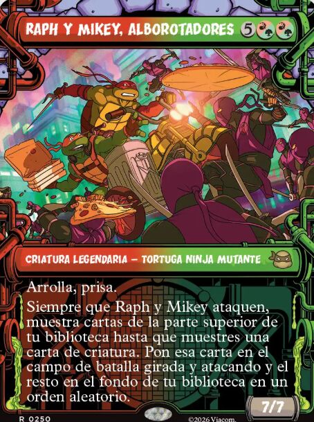 Una carta que funciona muy bien con esta combinación de tortugas es Raphy Mikey, Alborotadores. Criatura con prisa, que provoca la salida a campo de batalla de otra criatura, lo que puede desencadenar el caos que tanto les gusta a estas tortugas.