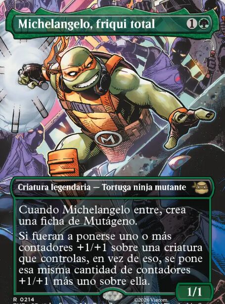 Michelangelo, friqui total, es otra carta que permite crear los mutágenos que alimentan de contadores a las criaturas para activar la habilidad principal de Raphael, The Muscle. No solo eso, sino que además, si se va a poner un contador +1/+1 sobre una criatura que controlas, en vez de eso, se pone esa misma cantidad de contadores sobre ella +1. Es decir, se suma un contador extra cada vez que alguna habilidad o carta lo permite.