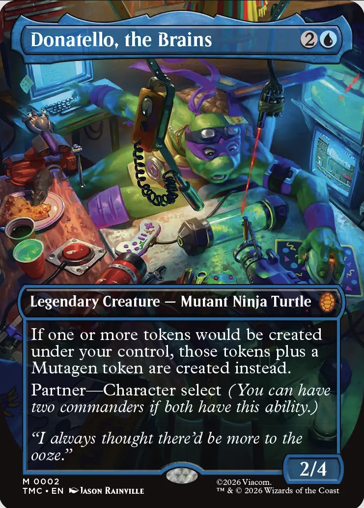 Donatello, the Brains, es el cerebrito y manitas del equipo, con sinergias directas con los tokens. Si uno o más tokens van a ser creados bajo tu control, estos tokens crean automáticamente un token mutágeno. Combina muy bien con habilidades de artefactos, así como con la afinidad de los mismos. Todo esto con la habilidad de Partner, que te permite tener un segundo comandante con el que combinar habilidades.