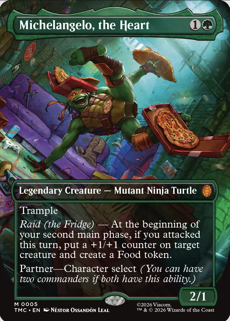 Michelangelo, the Heart, es el Partner perfecto para todos sus hermanos, y aunque con Raphael hacen las fiestas más caóticas, con Leonardo o Donatello, sus habilidades se benefician mutuamente. Con su habilidad de Raid (the Fridge), que le permite poner contadores en la segunda fase de turno (después de atacar), siempre y cuando hayas atacado, puede realizar combinaciones definitivas con las de sus hermanos. Como en las películas y las series, es el corazón que une a las Tortugas Ninja. Además, crea un token de comida, que siempre viene bien para generar maná extra.