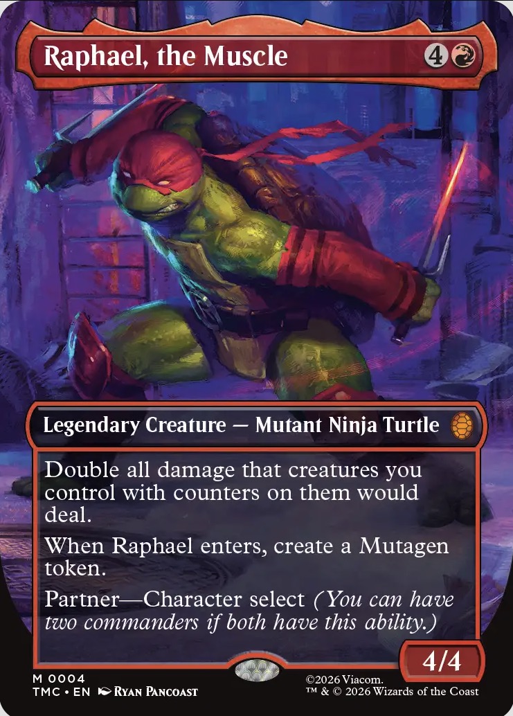 Con Raphael, la fuerza está garantizada. Se trata de una carta que puede ser utilizada como comandante de color rojo, con una habilidad que permite duplicar el daño que hacen tus criaturas con contadores. La renovada habilidad de Partner permite tener a más de un comandante, con lo que se activa su cooperación con otros comandantes para acertar en la combinación de colores. Además, cuando entra al campo de batalla, crea un token de Mutágeno, que es un artefacto ficha que permite pagar un maná para sacrificarlo y poner contadores como conjuro (en tu turno).