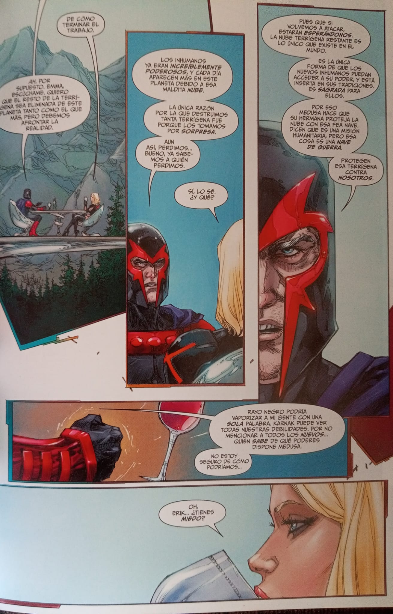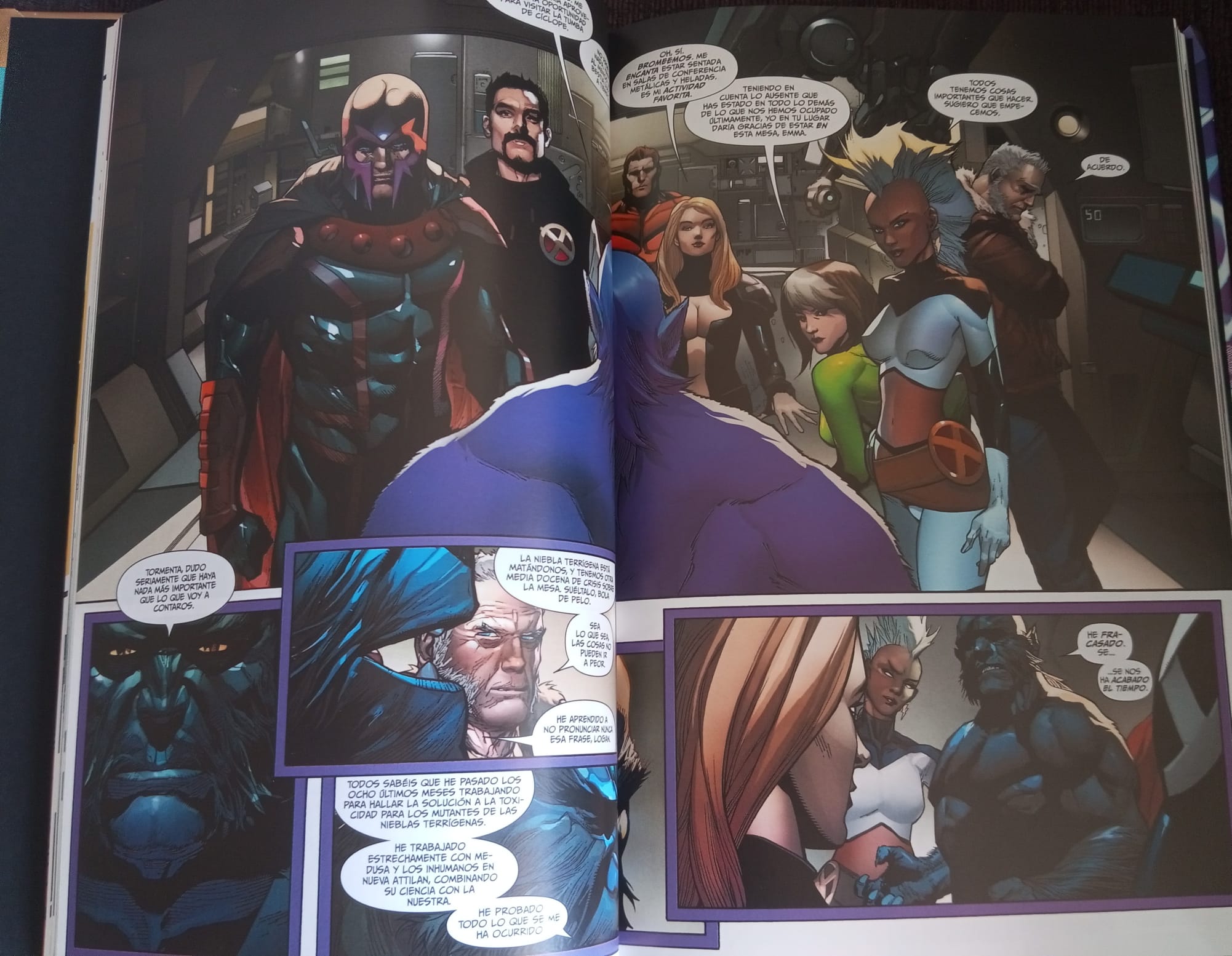 Inhumanos vs Patrulla X: guion de Charles Soule y Jeff Lemire, dibujo de Leinil Francis Yu y Javier Garrón, cartoné tapa dura, contiene Inhumans Vs. X-Men 0-6, editorial Panini, 208 páginas y un precio de 20 euros.