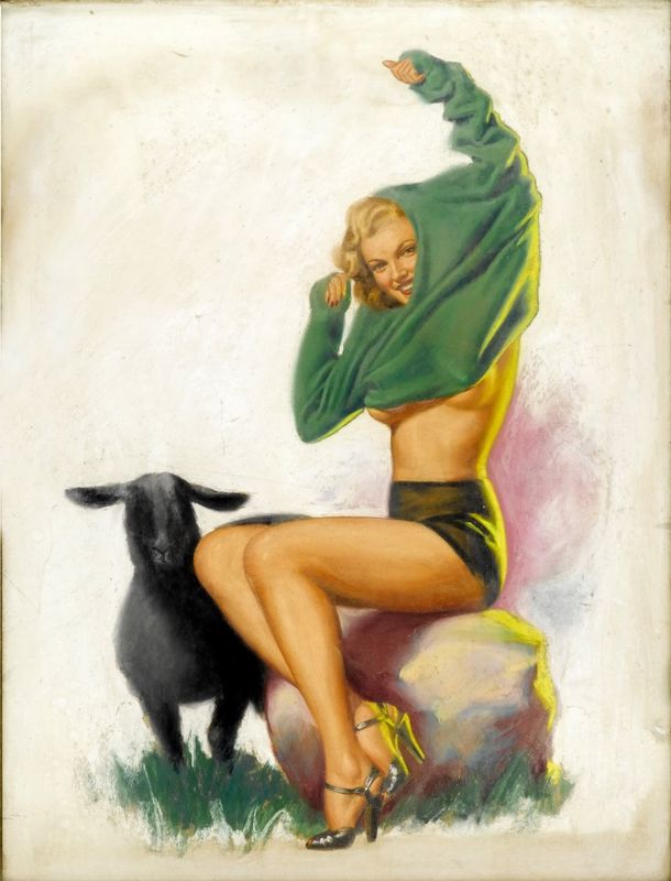 Un recurso un tanto pedestre era dibujar a la pin-up poniéndose un jersey de lana junto a una oveja negra como el carbón en medio del campo.