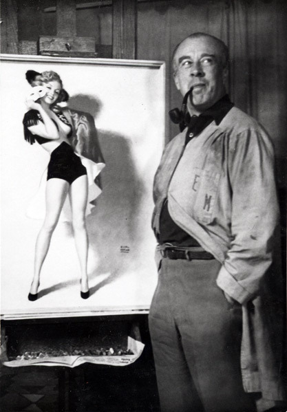 Earl Moran posa orgulloso delante de la ilustración en la que Marilyn había posado de la pin-up torera con antifaz. A partir de finales de los años 60, Moran se dedicó a las bellas artes pintando cuadros de desnudos más perfeccionados, aunque sin la vitalidad y glamour de sus años de gran ilustrador de pin-ups.
