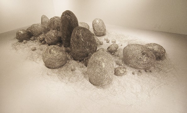 Kyoko Kumai usa alambre delgado para crear un paisaje rocoso. Como, por ejemplo, en esta "Tiempo", realizada en filamento de acero inoxidable cosido. A partir de 1983 esta artista pasó, desde sus tapices y textiles murales, a trabajar en esculturas e instalaciones en acero inoxidable. Ella afirma que su obra no guarda relación directa con los textiles, sino, más bien, con la abstracción e interpretación de la naturaleza y el contexto orgánico en el que estamos insertos.