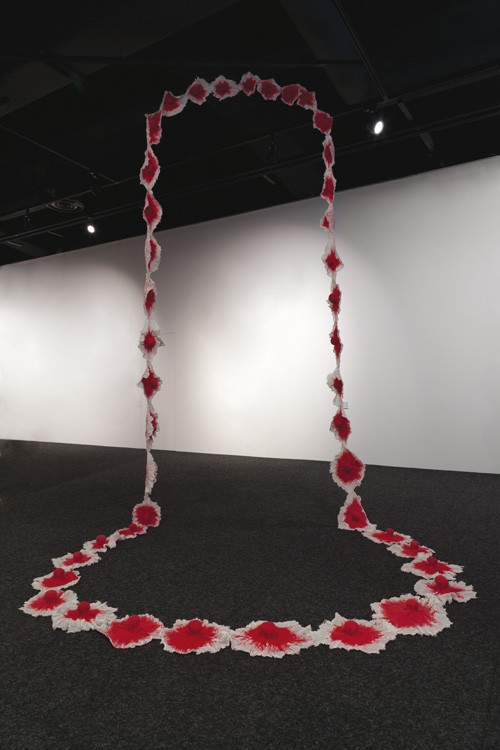 La artista Akiko Kumazawa presenta en la exposición Fiber Futures su "Encadenado Daisy". Para crear la obra se han utilizado materiales como algodón y gasa.