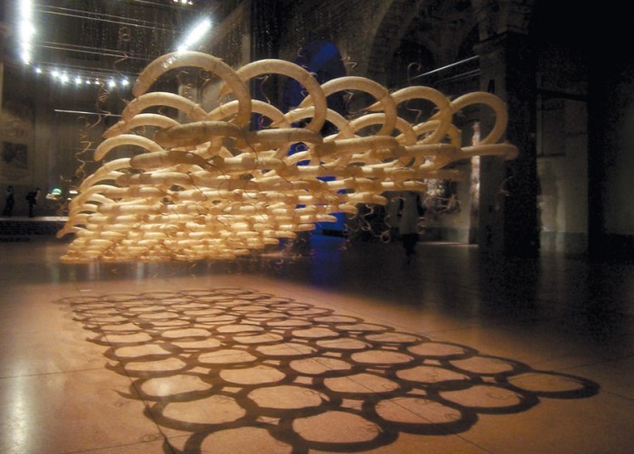 Kyoko Ibe, en esta obra, muestra una red de papel teñida, tomada de un antiguo sutras budista cortada en tiras. El artista se inspiró en el terremoto y tsunami de Japón.