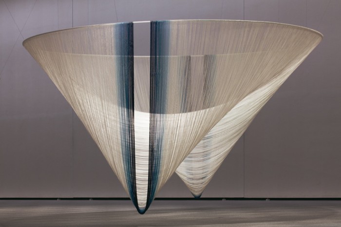 La obra de Akio Hamatani se llama W-Orbit. Ésta es una de las figuras más espectaculares de la exposición, por su tamaño, concepto y construcción. Está hecha de hilos muy finos de rayón ensartados en un marco de metal, que cuelgan por el efecto de la gravedad. Además, los dos extremos están teñidos de azul, degradándose hasta llegar al blanco.