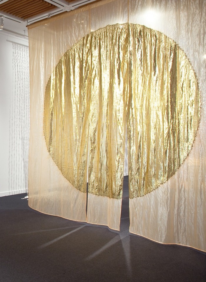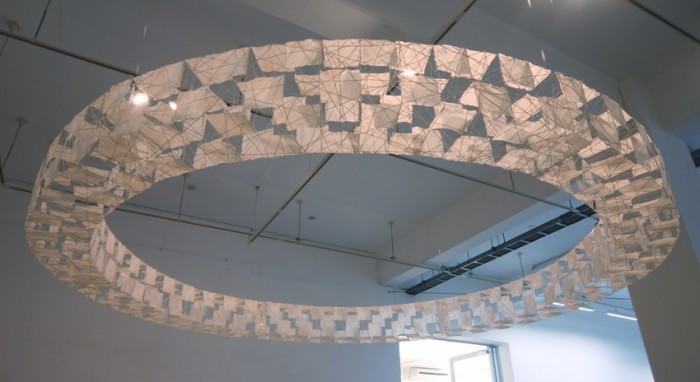 La obra de Naomi Kobayashi es una de las mayores figuras de esta exposición de arte textil internacional. Naomi presenta un anillo de 2m de diámetro creado con papel japonés.