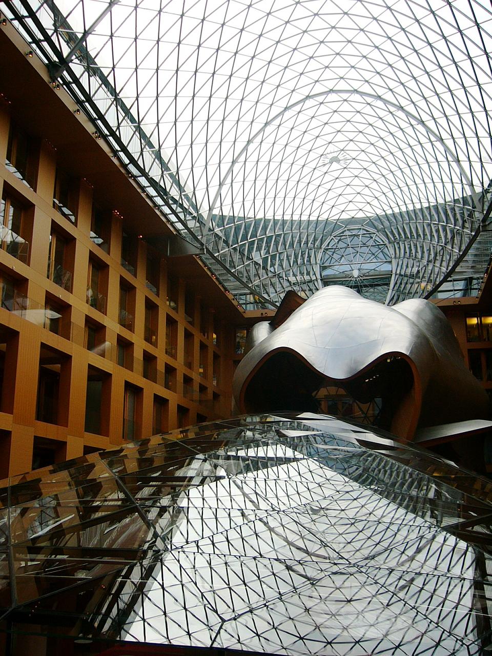 Las restricciones para construir en la zona de Berlín en la que se levantó este edificio impedían a Frank Gehry darle una de sus habituales cubiertas metálicas, por lo que tuvo que dejar su impronta en el interior, en una espectacular entrada en la que se mezclan el vidrio y el metal