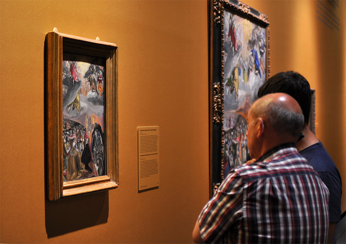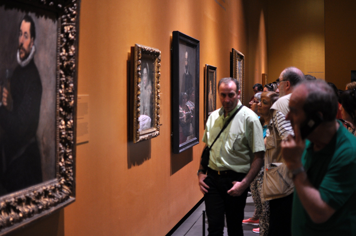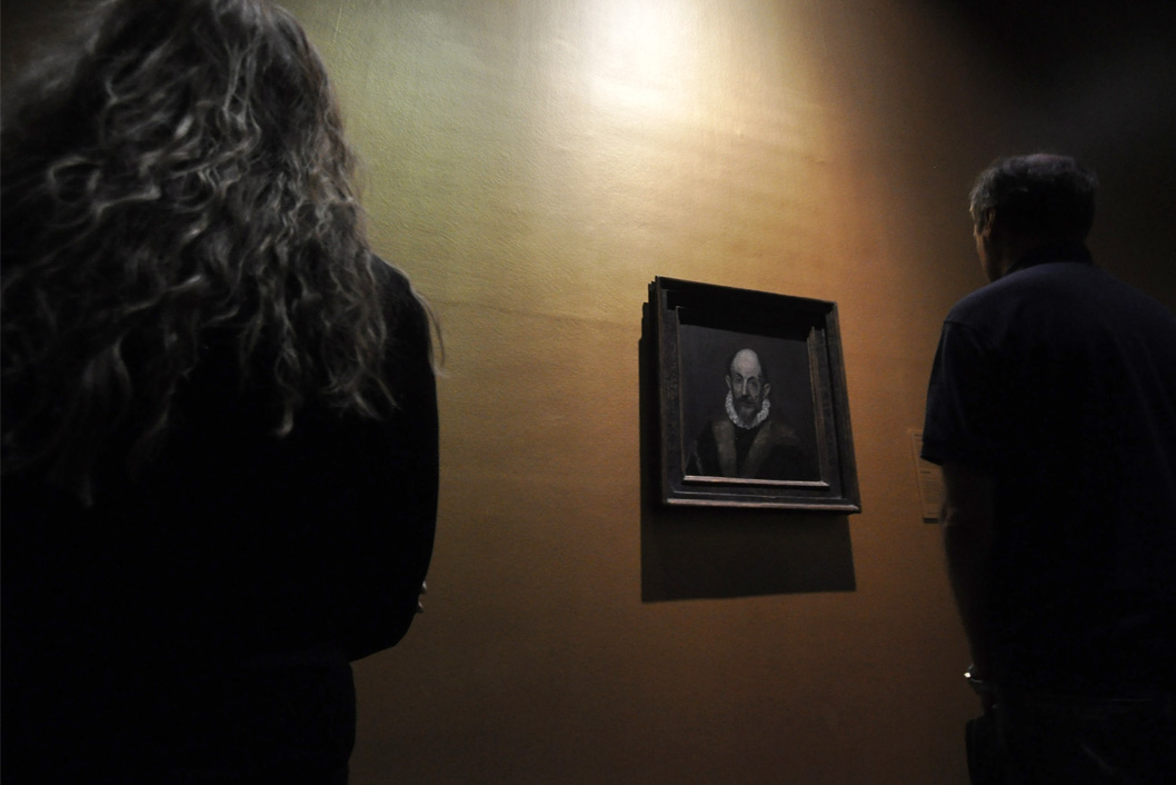 Ya en el interior del museo dos personas observan el cuadro Retrato de un caballero anciano, considerado un autorretrato del Greco.