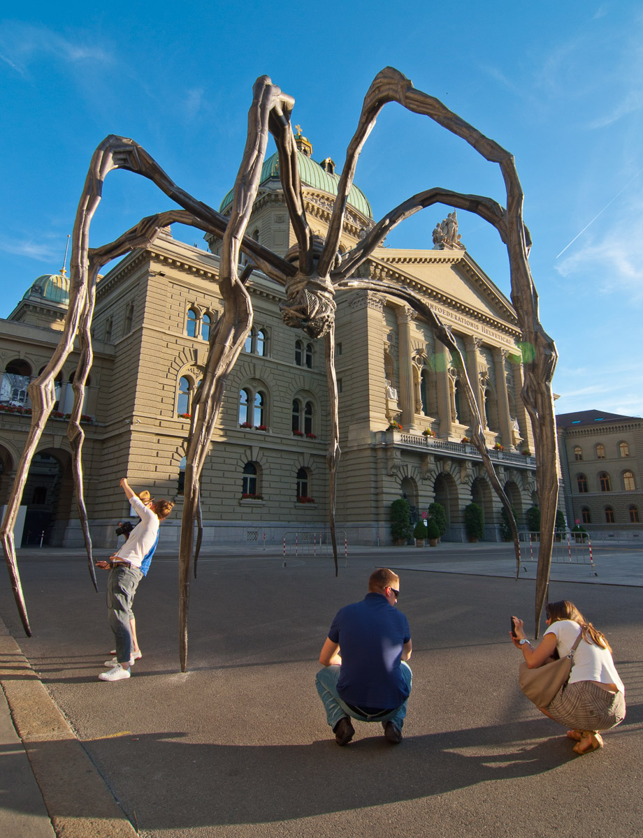 La veterana artista Louise Bourgeois realizó una serie de seis grandes esculturas de una gran araña que, para ella, representaba la maternidad. De un gran tamaño -casi 10 metros de altura- varias de ellas están en ubicaciones fijas como la entrada del Museo Guggenheim de Bilbao y, además, se ha montado temporalmente en muchísimas ciudades de todo el mundo. En la imagen la vemos cuando estuvo en Berna, frente a la sede del parlamento suizo