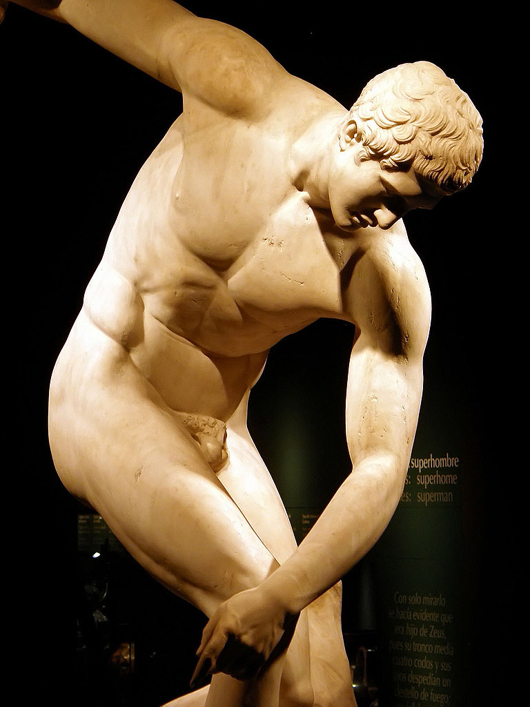Otra de las obras míticas de la Grecia clásica, el Discóbolo era originalmente una estatua de bronce que ha llegado a nosotros a través de copias romanas en mármol. El original de Mirón de Eléuteras se realizó a mediados del S V a.C. representaba a un atleta congelado en el momento del esfuerzo y se ha convertido también en un ideal de belleza. En la imagen, una de las copias romanas en una exposición el MARQ de Alicante