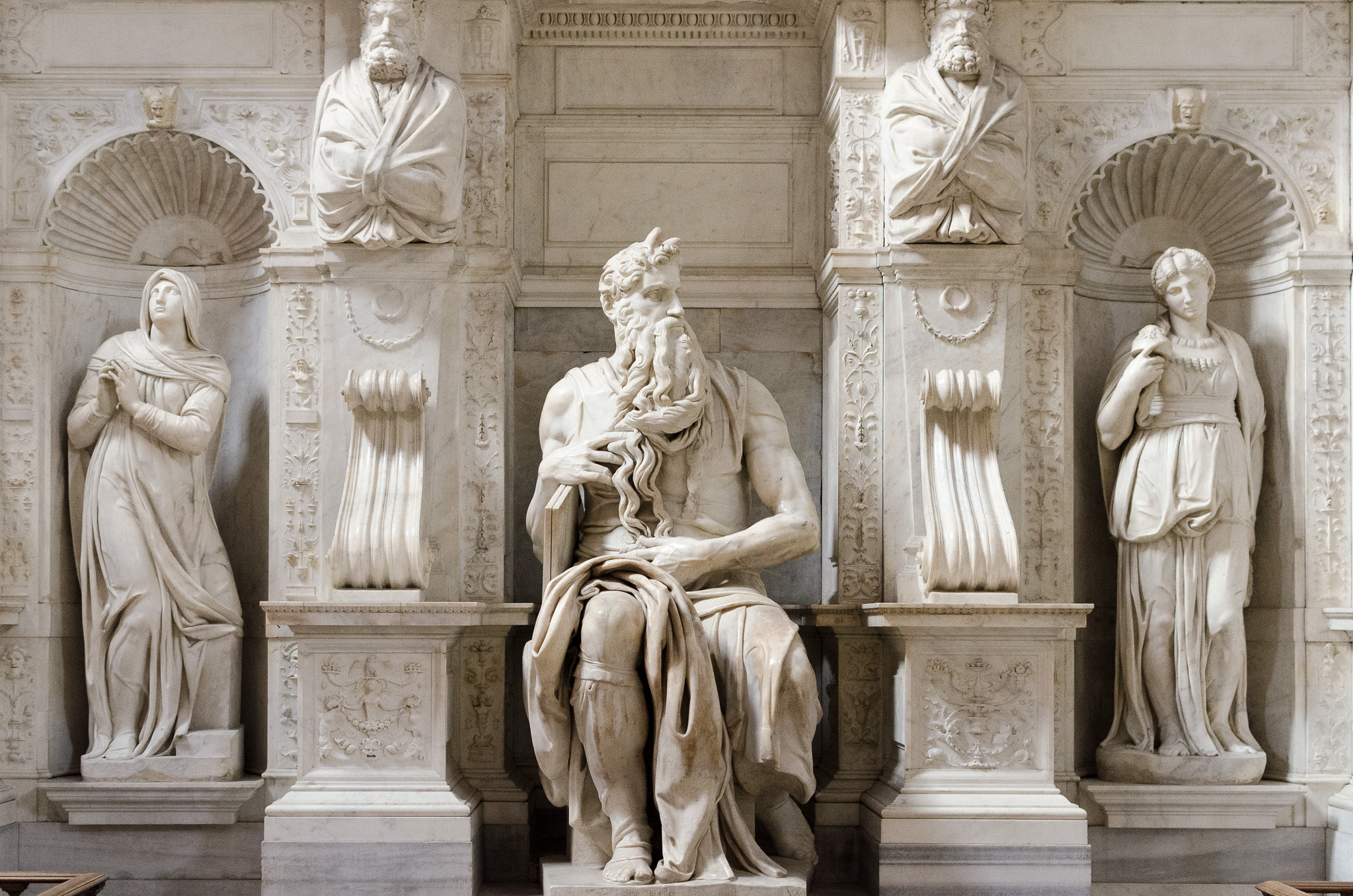 Concebida para la tumba de Julio II en el Vaticano, finalmente la impresionante figura de Moisés y la propia tumba se instalaron en San Pietro in Vincoli. La figura del profeta no es de un tamaño excesivo -la escala algo más grande que el natural y mide 2,35 metros- pero transmite una grandiosidad y una magnificiencia impresionantes. Cuenta la leyenda que al terminarla el propio Miguel Ángel la golpeó y le dijo: "¡Habla!"