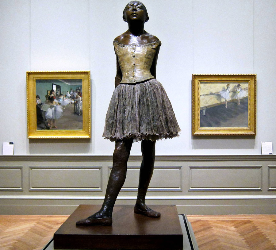 Esta pequeña bailarina fue la única de sus esculturas que Degas mostró todavía en vida, si bien no se trataba del bronce que vemos hoy en día sino de una figura de cera de un extremo realismo: peinada con cabellos auténticos, con un tutú de verdad y zapatillas auténticas. A su muerte se encontraron unas 150 piezas en cera y arcilla y ser realizaron varias copias en bronce de su bailarina, que fue muy criticada en su momento pero se ha convertido en una pieza de fama mundial