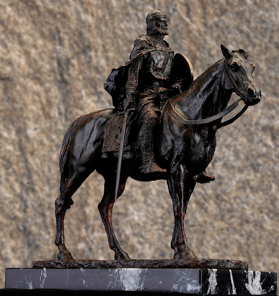 Magnífica y sobria escultura que representa a El Cid Campeador, montado sobre una Babieca presto para someterse a las órdenes del "martillo castellano".Realizado al máximo de sus detalles con ropaje de malla y escudo con dragón rampante. Medidas: Alto 30 cm. Ancho 20 cm. Peso 6 kg. Tirada: 100 ejemplares
