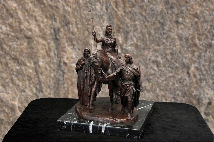 "El camino hacia la unidad de España". Isabel la Católica enarbola una cruz procesional guiada por el Cardenal Mendoza y el Gran Capitán. Esta obra está considerada como una de las más importantes de carácter monumental. Medidas: Alto 35 cm. Ancho 25 cm.