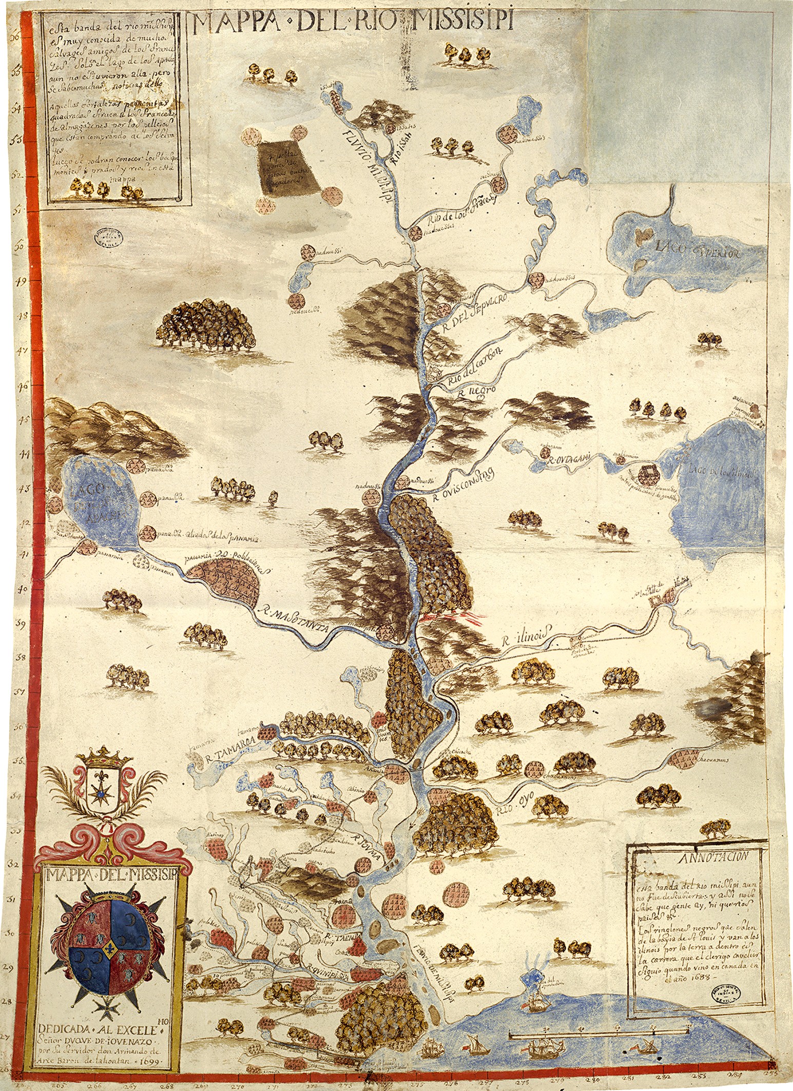 Mapa del Río Misisipi, dedicado al duque de Jovenazo por su servidor don Armando de Arce, barón de Lahontan (1699)