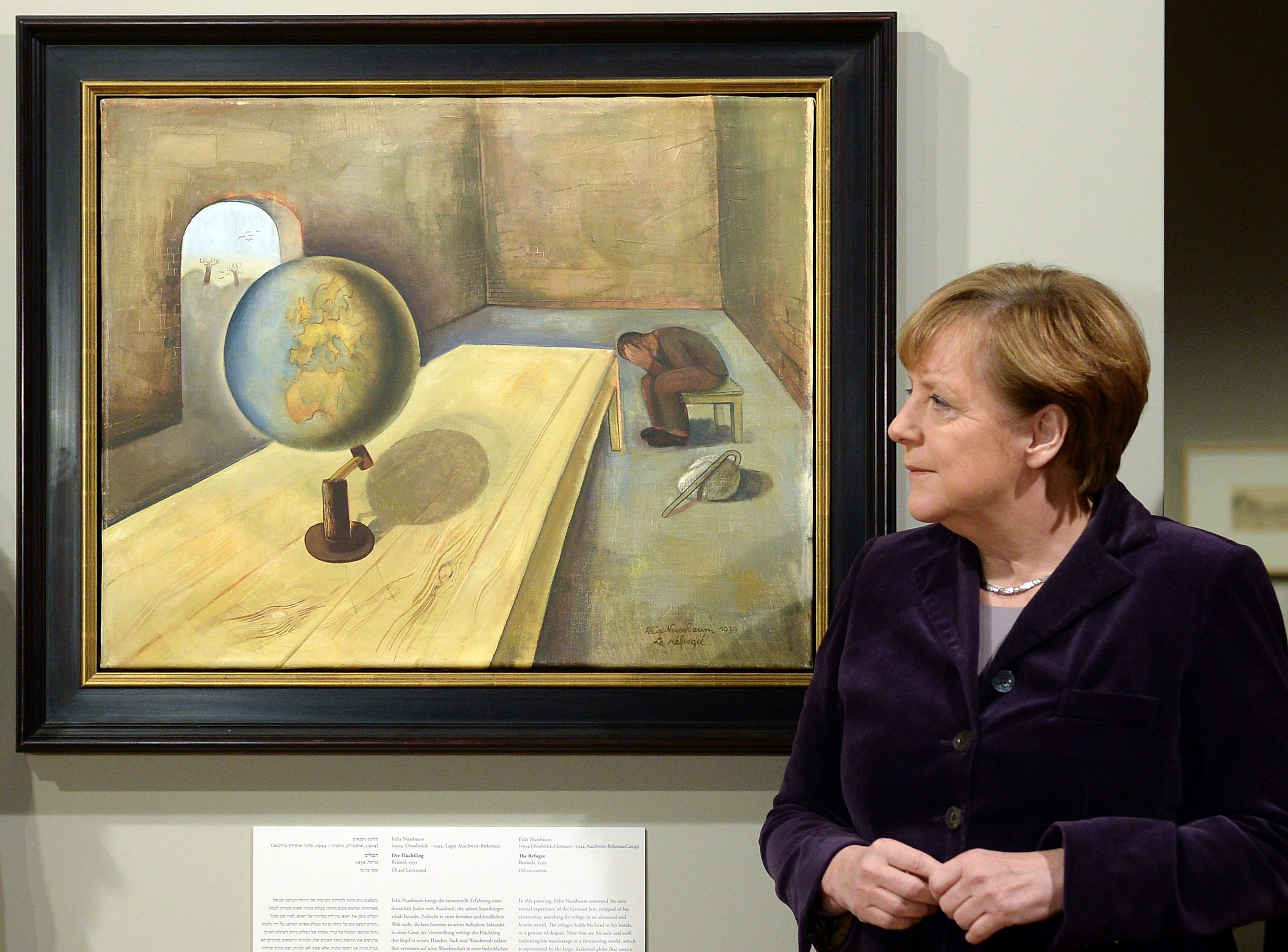 La canciller alemana Angela Merkel durante la inauguración de la exposición Arte en el Holocausto