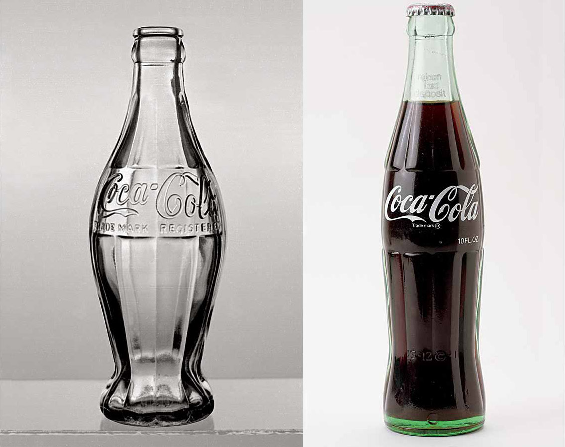 A principios del S XX el mercado de Estados Unidos estaba lleno de productos imitando a la Coca-Cola y para los consumidores no era fácil distinguirlos de la verdadera, ya que todos se vendían en botellas muy similares cuyo diseño era decisión exclusiva de la embotelladora y con etiquetas que se imitaban y a menudo se caían. Coca-Cola se decidió a cambiar eso y en 1915 encargó un diseño de botella que iba a ser exclusivo para la marca que empezó a comercializarse en 1916, hace justo un siglo. El primer diseño era bastante más redondeado, como vemos en la imagen de la izquierda, pero se estilizó para adaptarse a las necesidades de producción. Unas décadas después un estudio demostró que menos de un 1% de americanos eran incapaces de reconocer una botella de Coca-Cola por la forma.