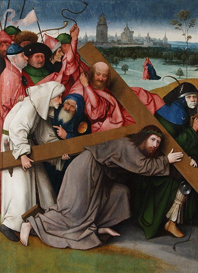 La exposición El Bosco en El Escorial, que se puede visitar hasta el 1 de noviembre 2016, devuelve las obras a su lugar de partida. Da la bienvenida al visitante con un grabado del pintor flamenco, que pertenece a una serie de retratos de artistas ilustres realizada por Cornelis Cor en 1572, custodiada por la biblioteca de El Escorial. La muestra la preside el cuadro Cristo con la cruz a cuestas. "Es un original considerado por toda la crítica especializada como una de los grandes obras de El Bosco, por su manera tan particular de interpretar el tema, con un Cristo sufriente en el centro de la composición y alrededor una multitud impasible", detalla García-Frías. Esta obra también formará parte de la gran retrospectiva del artista flamenco que prepara El Prado.