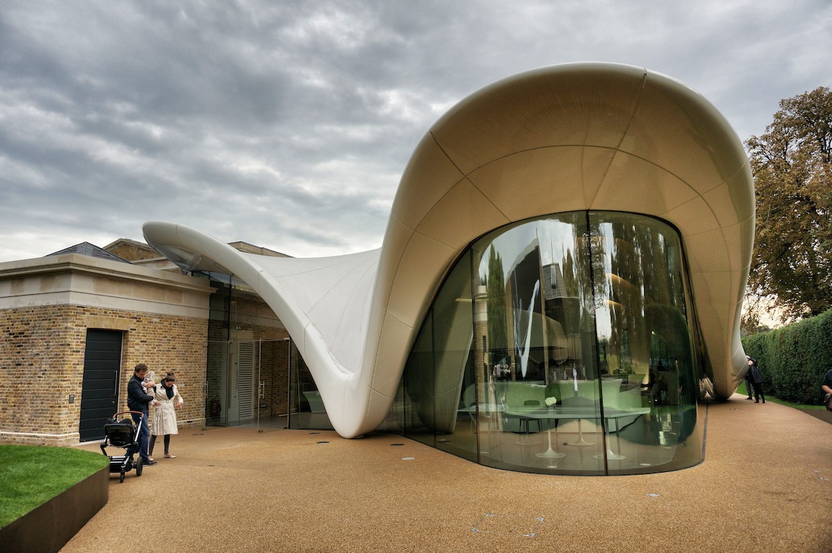 Hadid diseñó una estructura de acero con tejados triangulares planos que crean diversos espacios internos para un pabellón que inauguró la tradición de esta galería de construir anualmente un espacio temporal.