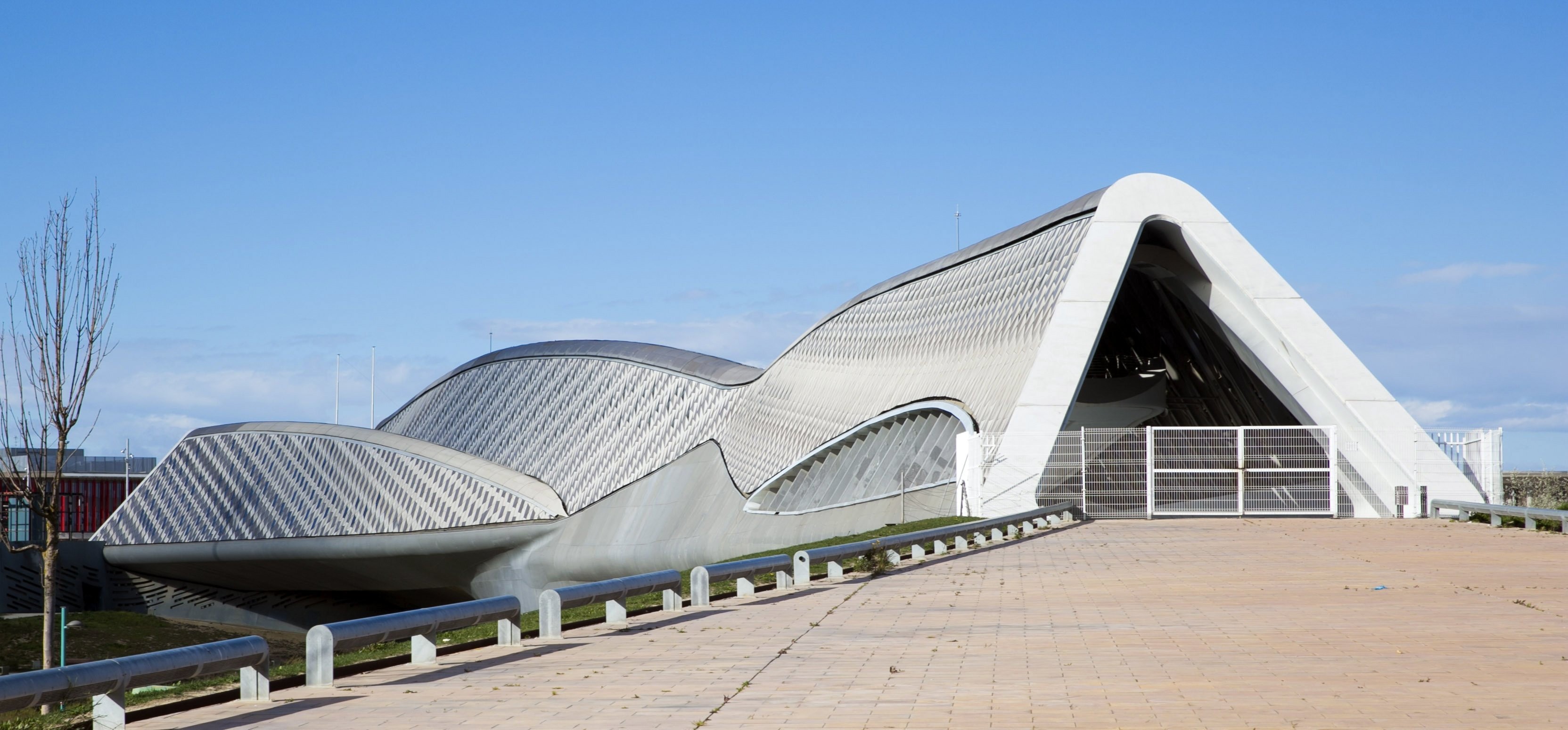 Vista del pabellón puente sobre el río Ebro, en Zaragoza, obra de la arquitecta angloiraquí Zaha Hadid. Construido para la Expo 2008, este edificio-puente de 280 metros se construyó cruzando el Ebro como principal acceso al espacio de este evento. Fue el primer puente construido por la arquitecta y sus preciosas curvas cubren además una zona de exposición.