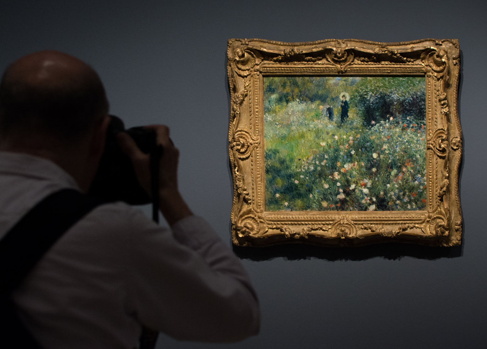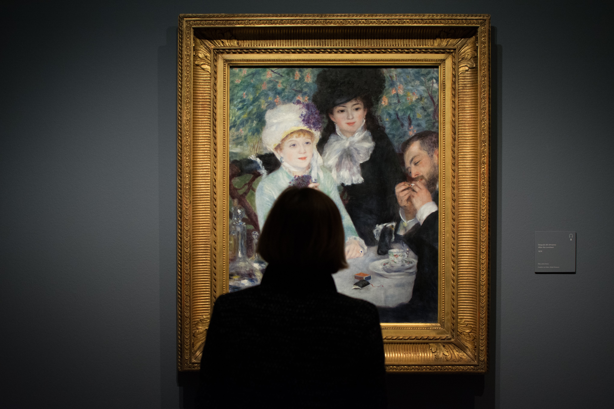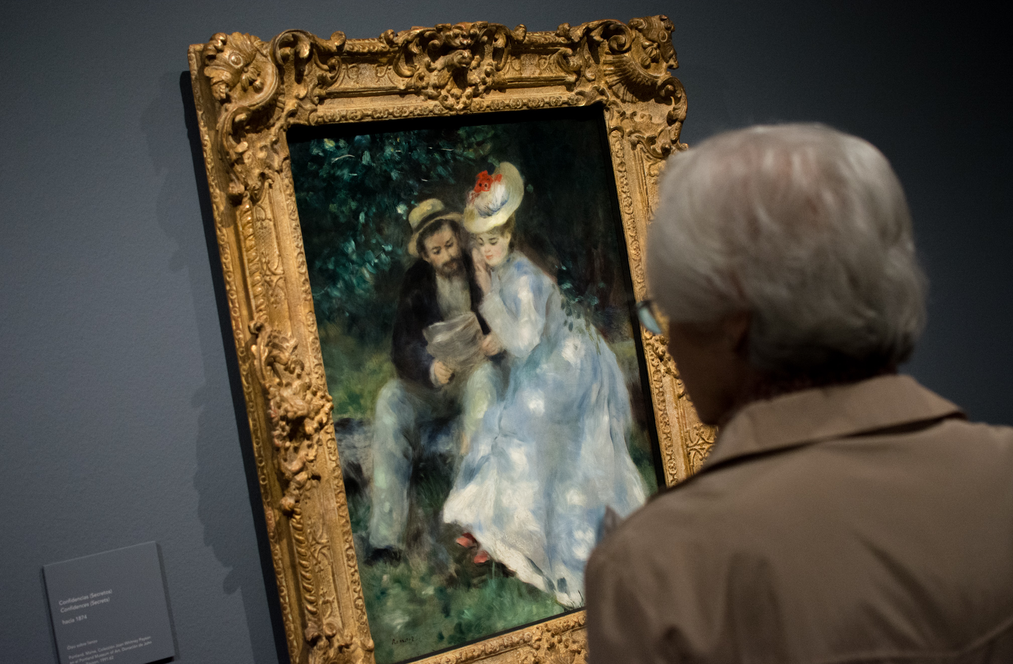 Una mujer observa el cuadro Confidencias, pintado por Pierre-Auguste Renoir hacia 1874.
