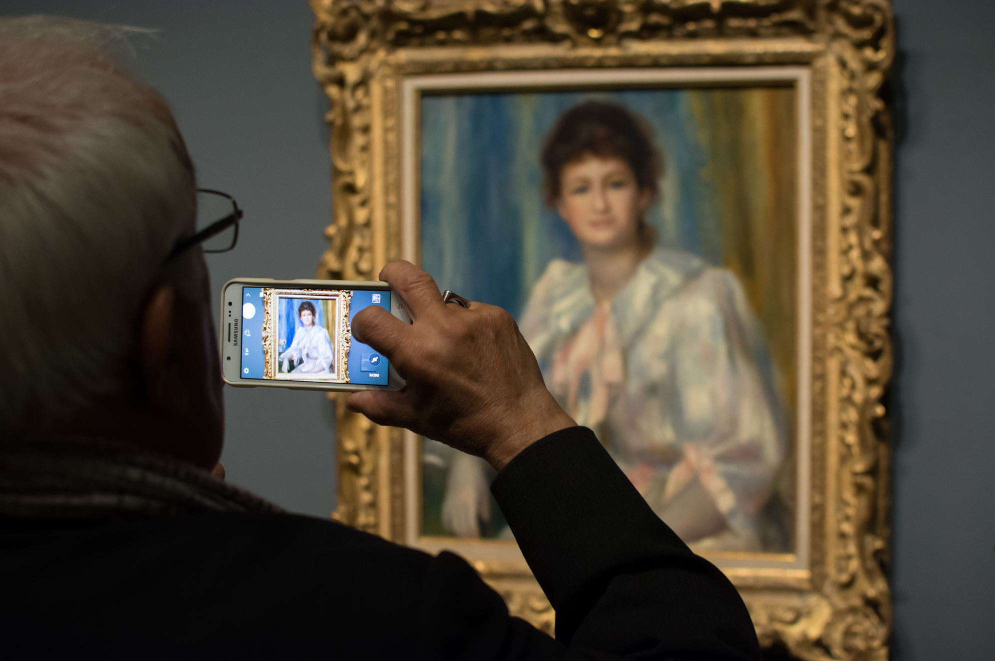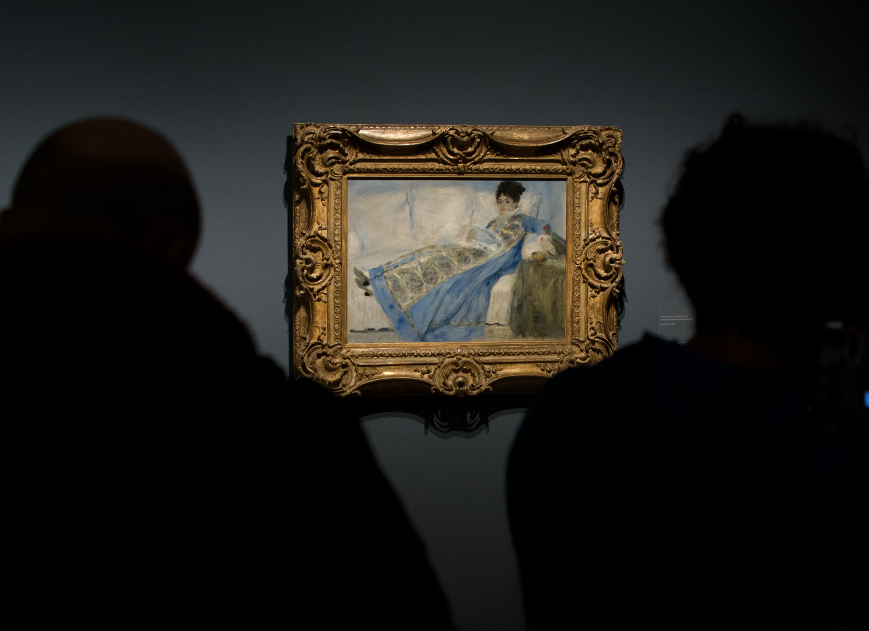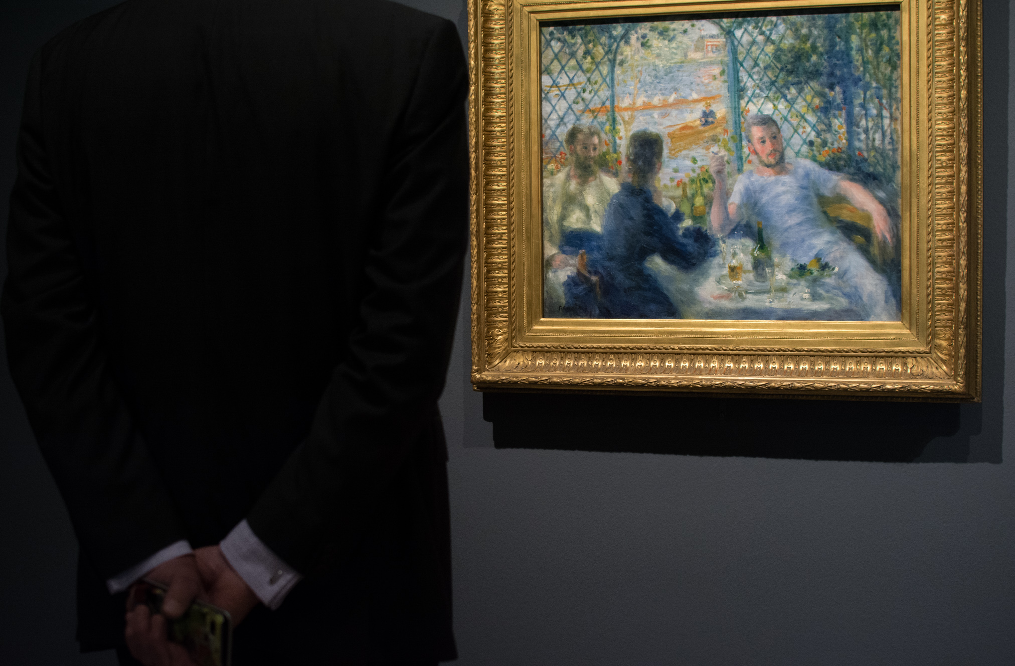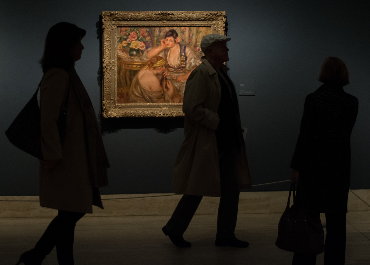 Una mujer observa el cuadro Confidencias, pintado por Pierre-Auguste Renoir hacia 1874.