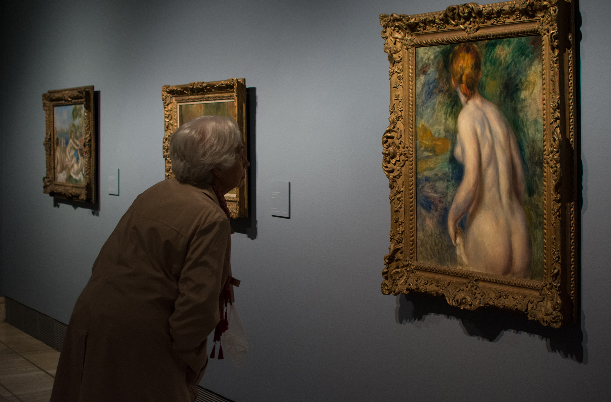 Una muer observa la obra Desnudo de espaldas, pintado hacia 1876. Pierre-Auguste Renoir.
