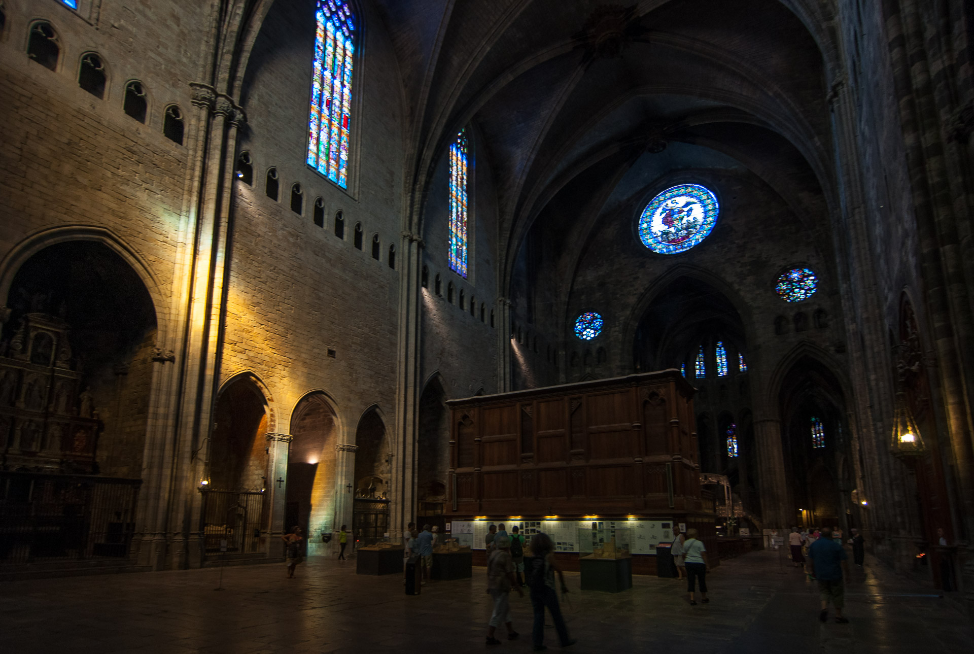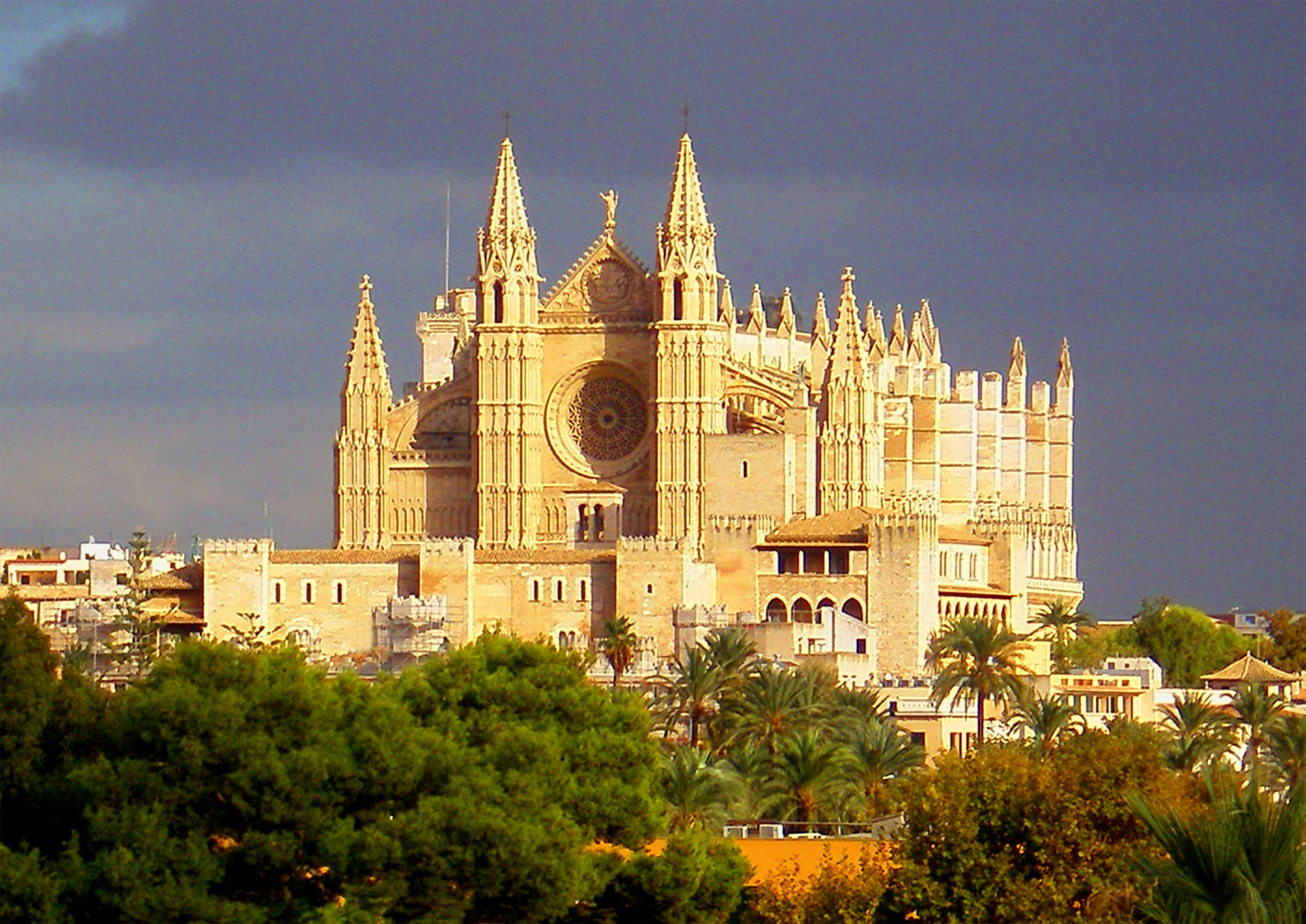 Quizá también por su ubicación al borde del mar que no es muy habitual -quizá sólo la catedral de Cádiz está tan cerca de la orilla-, lo cierto es que los enormes contrafuertes de la Catedral de Santa María de Palma de Mallorca la hacen una de las más reconocibles de España. Precisamente gracias a esos enormes contrafuertes se descarga a las paredes de buena parte de su labor de sustentación de las bóvedas, lo que permite hitos arquitectónicos como el enorme rosetón, que con sus 13 metros de diámetro está considerado el mayor de las catedrales góticas; y por supuesto una altura impresionante para las naves: la nave central mide 43,95 metros de altura mientras que la de Burgos, por ejemplo, tiene 25 metros. Empezó a construirse en el siglo XIII y no se terminó hasta finales del XVII.
