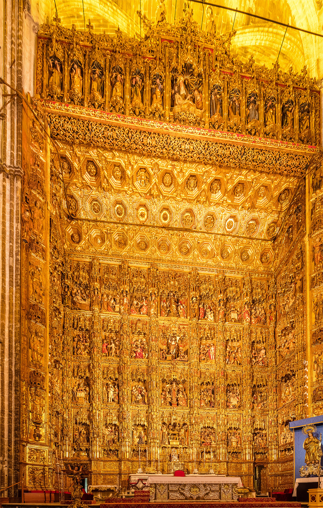 Ochenta años tardó en hacerse el impresionante retablo de la Catedral de Sevilla, probablemente el más impactante del arte español. El diseño original era obra del escultor flamenco Pedro Dancart, y su trabajo fue continuado por toda una colección de tallistas españoles y foráneos que en diversos momentos fueron incorporando nuevos elementos con los que terminó teniendo 44 relieves principales además de un sinnúmero de piezas más. En conjunto se trata de una obra abrumadora, tanto por su tamaño como por su calidad