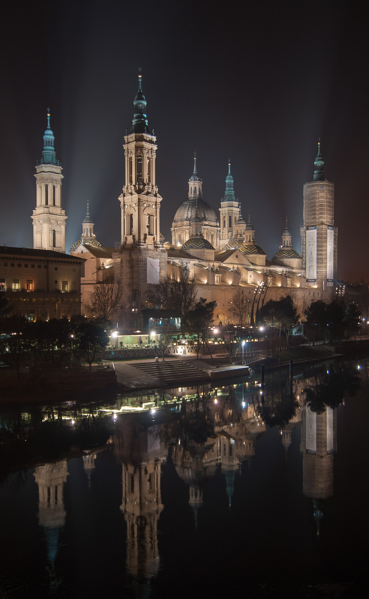La Basílica de El Pilar es un templo de dimensiones imponentes: 130 metros de largo por 67 de largo. Ese tamaño, su planta rectangular, sus cuatro torres y sus cúpulas logran darle un aspecto impresionante. El templo tal y como es ahora se empezó a construir a finales del S XVII, aunque partes importantes en este perfil llegaron mucho las tarde: algunas cúpulas en 1872 y las torres de los ángulos ya en el siglo XX