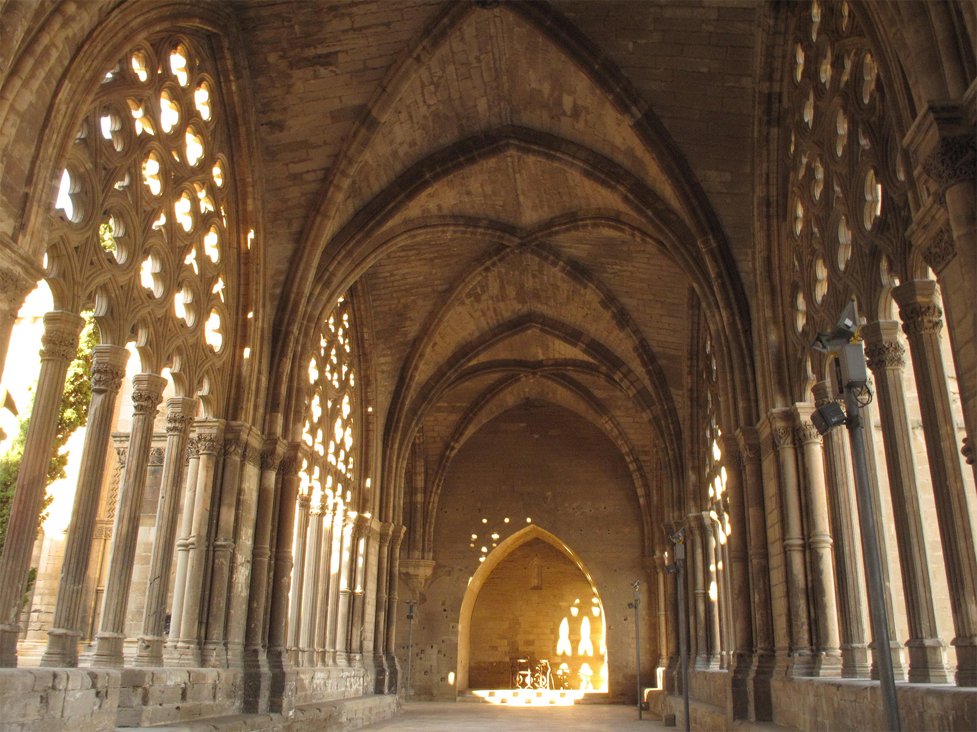 El claustro de la Catedral de Lérida empezó a construirse en el siglo XIII y se terminó ya en el XIV. Notable por sus dimensiones -algunos autores lo señalan como el más grande de Europa- y también por la belleza del gótico puro de sus bóvedas y sus espectaculares ventanales, mientras que los capiteles van desde el románico al gótico tardío. En uno de sus lados se abre a la ciudad como un balcón con unos ventanales que ofrecen una vista excepcional de Lérida y que hacen el conjunto aún más interesante
