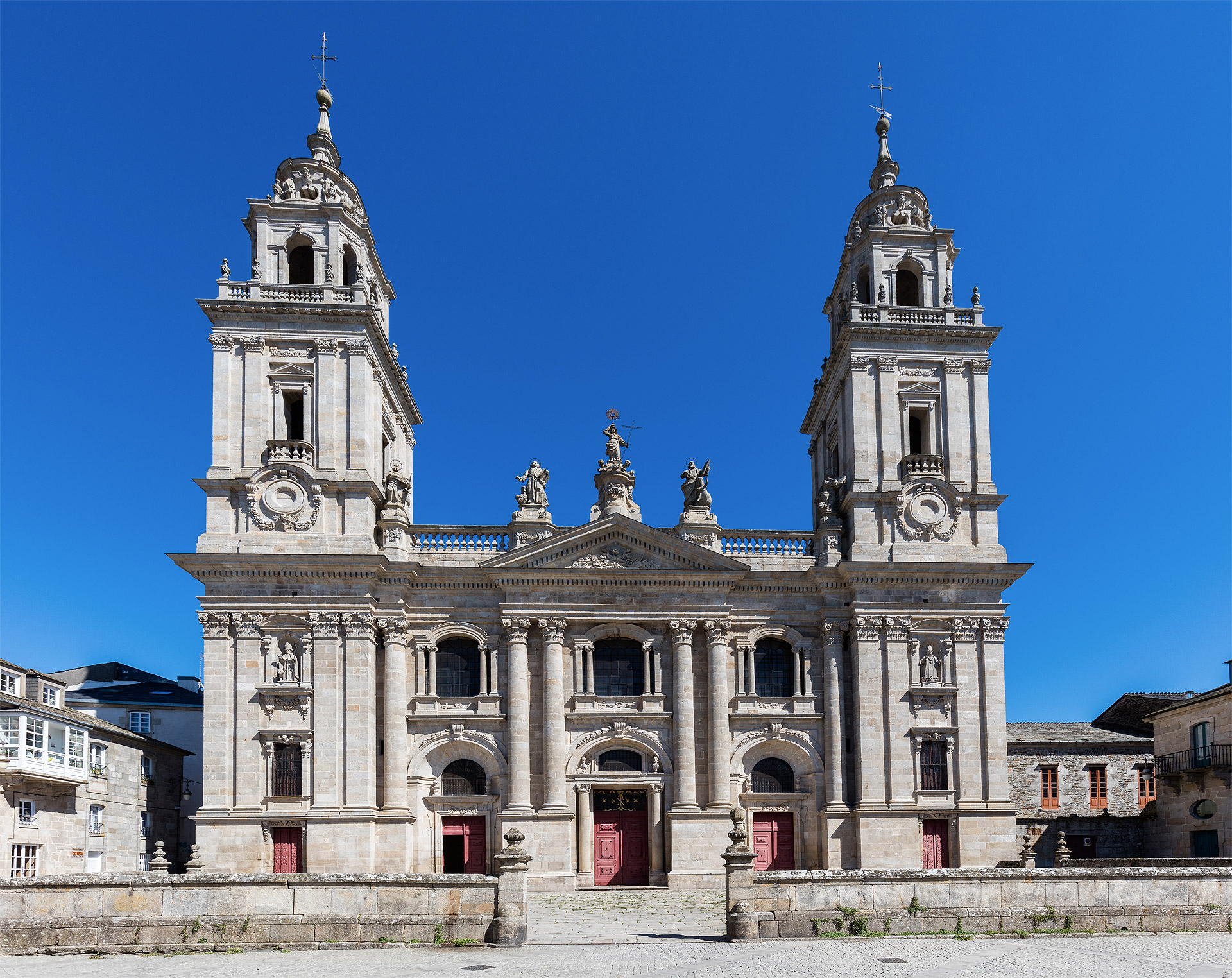 La catedral de Lugo es un edificio románico al que posteriormente se le han ido añadiendo partes en diferentes estilos, tal y como es habitual en tantas y tantas catedrales. Uno de estos añadidos es una bellísima fachada neoclásica -un estilo no demasiado habitual en nuestro país para las iglesias- que Julián Sánchez Bort diseñó alrededor de 1769.
