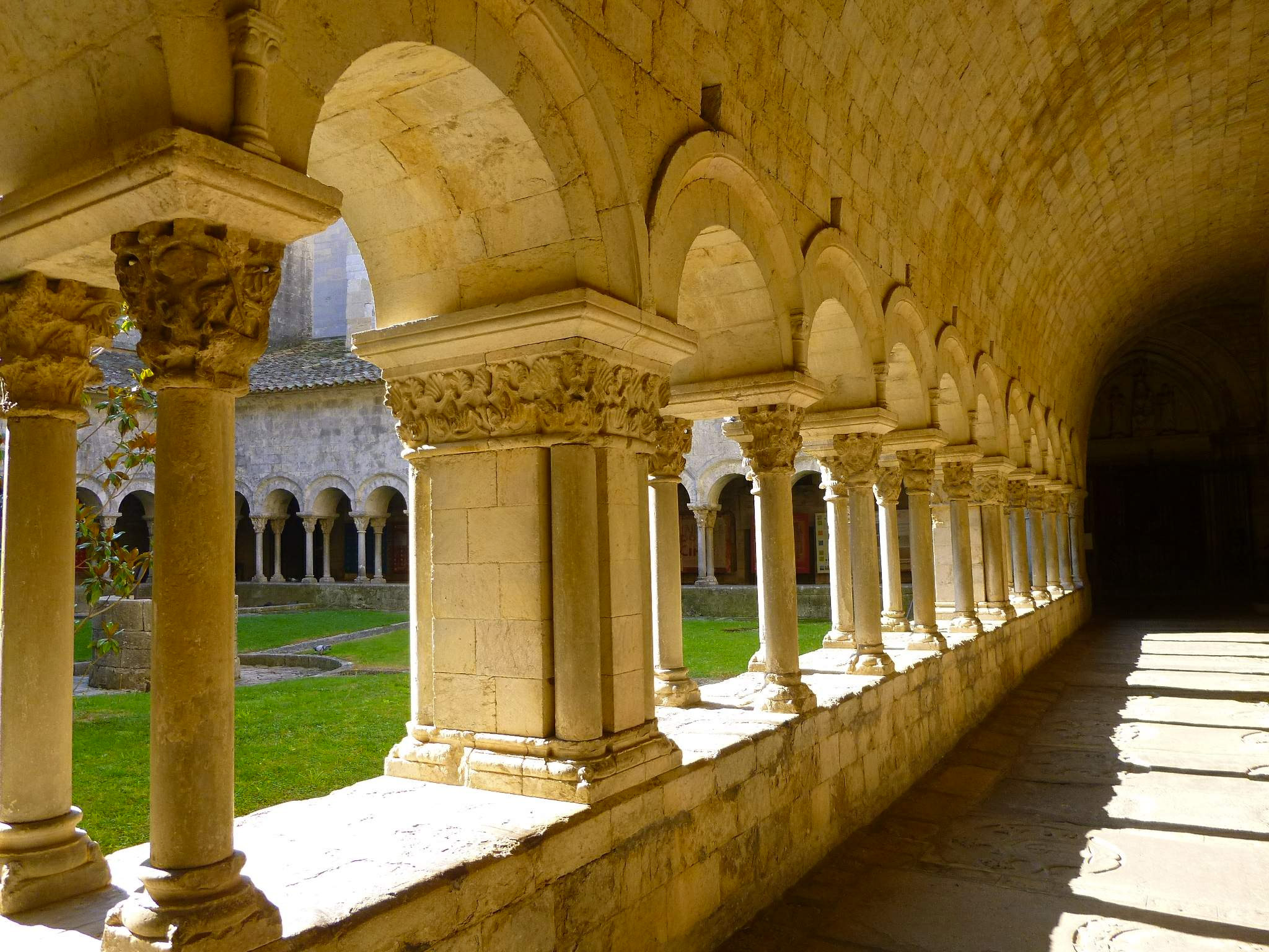La mayor parte de los grandes claustros románicos de España están en monasterios y no en las catedrales en las que los originales románicos fueron reformados en la mayor parte de las ocasiones, pero el de Gerona es una excepción: se mantuvo cuando se edificó el templo gótico. Tiene una forma trapezoidal forzada por la presencia cercana de las murallas y una serie de bellísimos capiteles en cuyos relieves hay curiosidades como representaciones del trabajo de los canteros