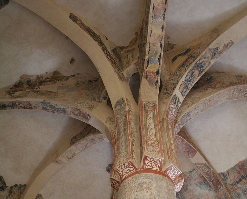 Nada más poner un pie dentro de ella, la sensación sigue siendo parecida. El contraste entre la claridad exterior y la oscuridad interior —el vano de entrada es la mayor fuente de luz del recinto— hace que se tenga la impresión de estar en una estancia algo desvencijada construida de piedra. Cuando las pupilas empiezan a adaptarse comienza la seducción. Ahí está, es lo primero que se ve, la palmera, grandiosa, sosteniéndolo todo, con restos de los dibujos y los colores que la cubrieron, abriendo nuestros ojos. La palmera es el pilar central que sostiene la cubierta, y sus ramas, ocho arcos que parten de ella y forman la bóveda. Escondido dentro de ellos hay un pequeño vano semicircular que representa otra de las incógnitas de San Baudelio, porque no se ha podido averiguar su condición real, si fue una mera solución arquitectónica ideada en honor a la estructura del Santo Sepulcro de Jerusalén o si tenía una utilidad práctica como relicario o camarín.