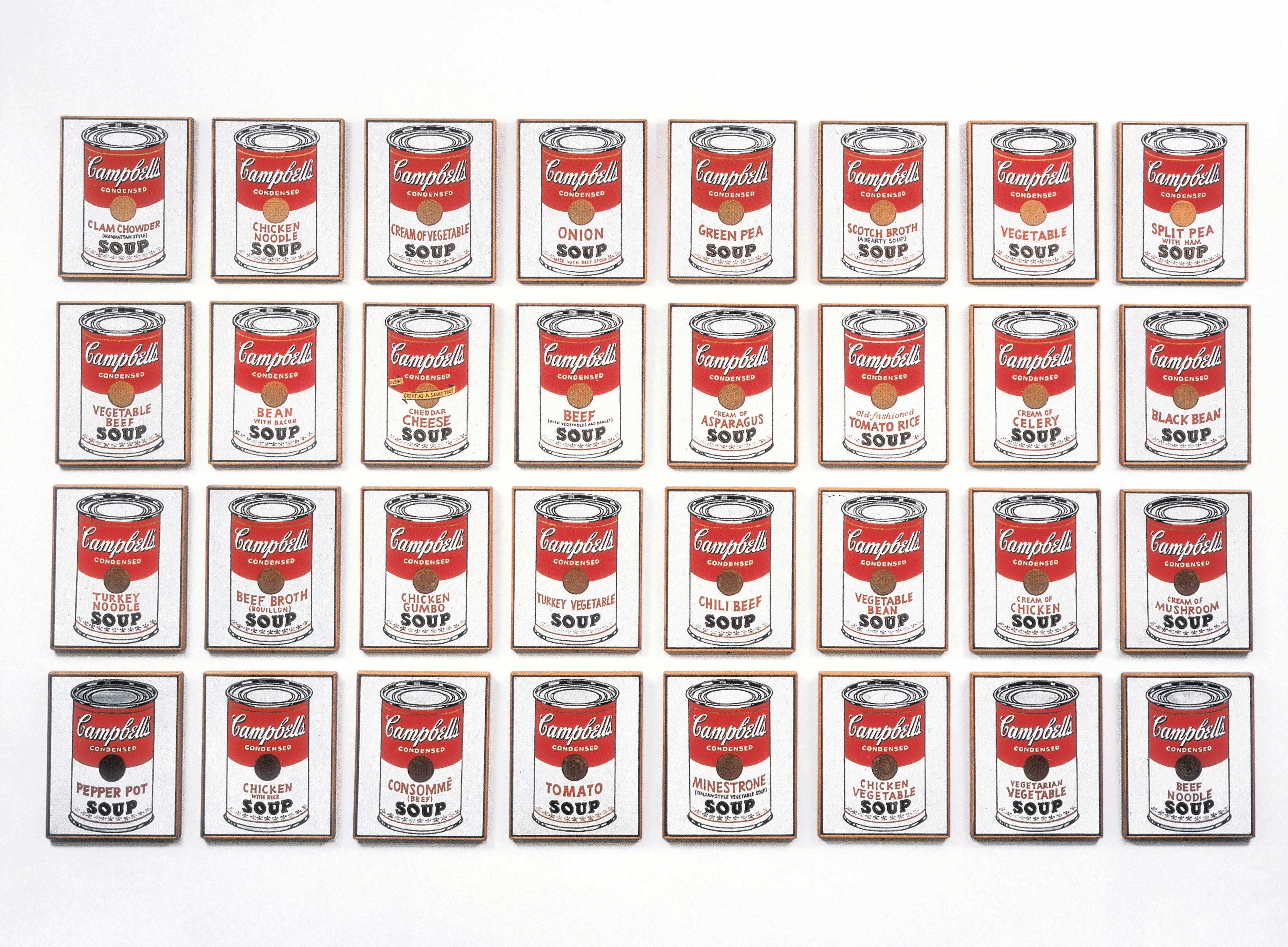 Latas de Sopa de tomate Campbells consta de 32 lienzos, uno por cada variedad que la marca comercializaba en 1962. Fue la obra que le granjeó la fama y los detractores.